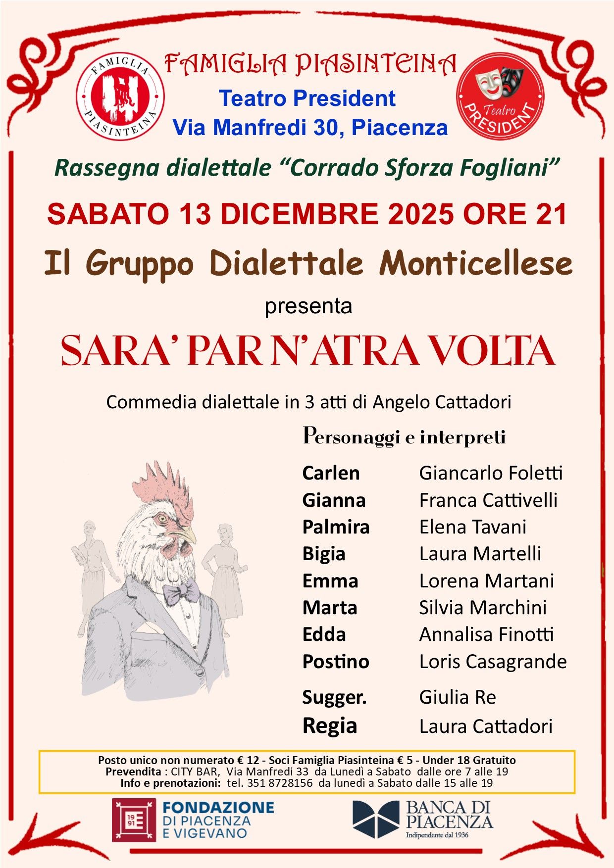 Sabato 13 dicembre, alle ore 21.00, il Teatro President di Piacenza ospita un nuovo appuntamento della Rassegna dialettale “Corrado Sforza Fogliani”, organizzata dalla Famiglia Piasinteina con il supporto della Banca di Piacenza e della Fondazione di Piacenza e Vigevano.