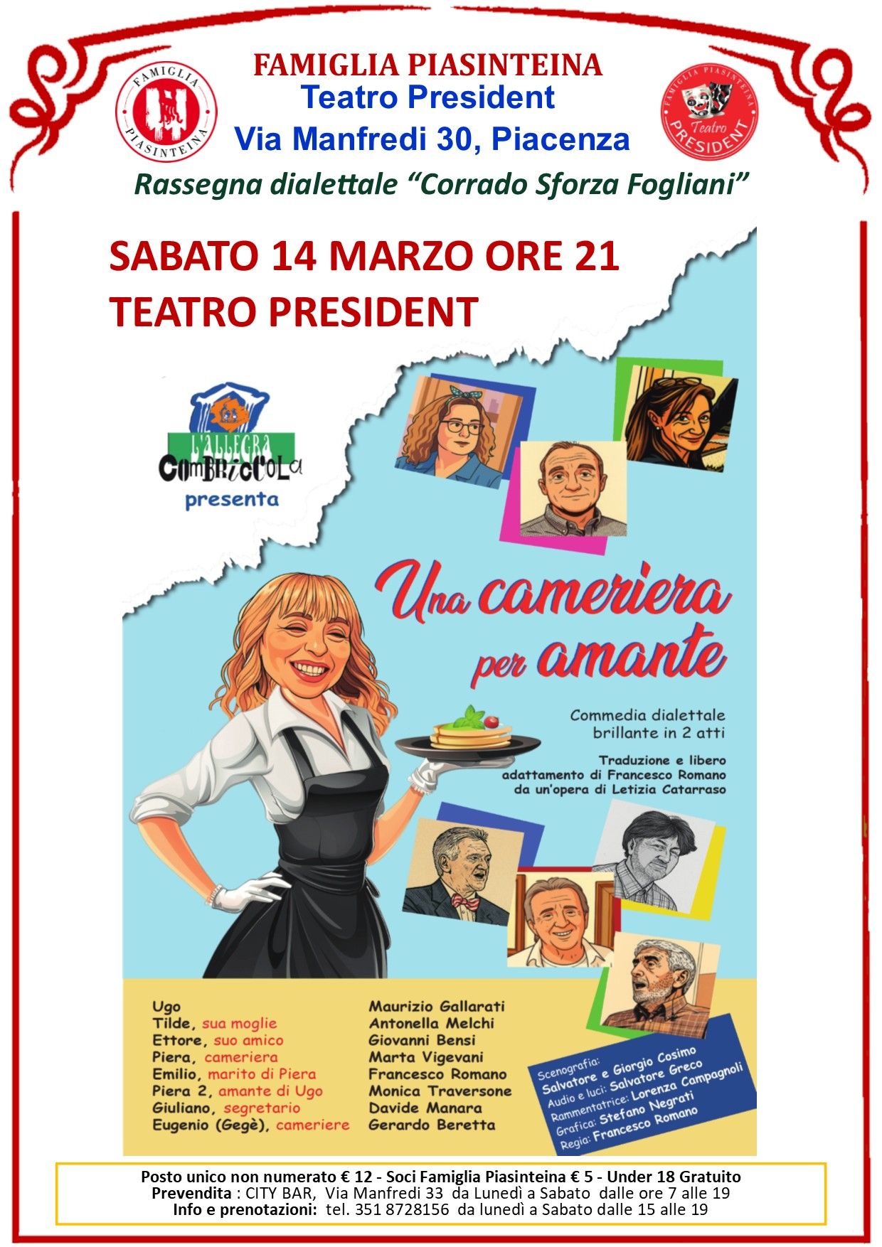 Sabato 14 marzo alle ore 21.00, al Teatro President, la compagnia teatrale l’Allegria Combriccola di Borgonovo porta in scena "Una cameriera per amante", commedia dialettale brillante in due atti di Patrizia Cattaraso, tradotta e liberamente adattata – su autorizzazione dell’autrice – da Francesco Romano, che firma anche la regia.