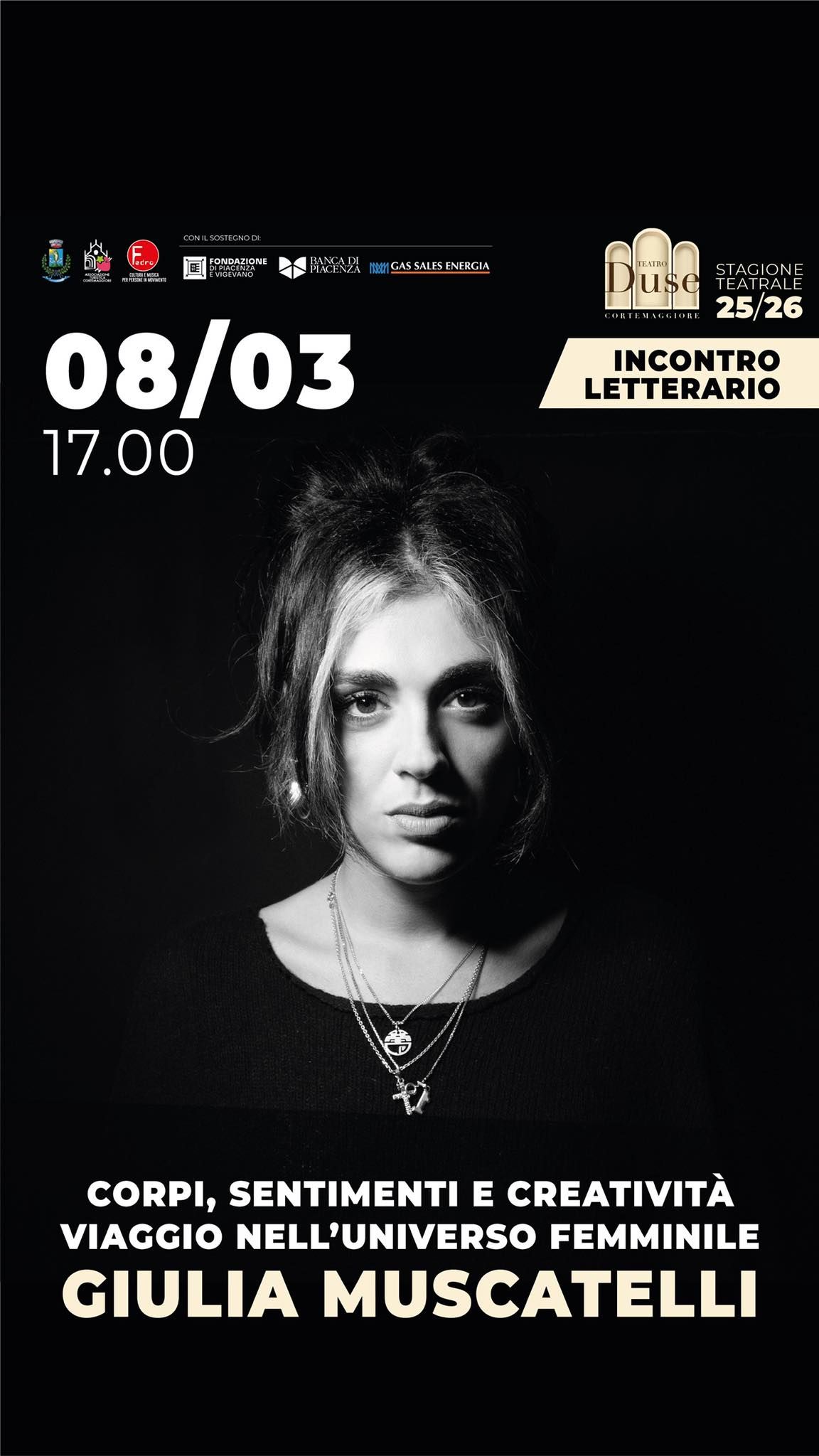 Domenica 8 marzo alle ore 17.00, in occasione della Giornata Internazionale della Donna, al Teatro Eleonora Duse di Cortemaggiore è in programma l’incontro letterario "Corpi, sentimenti e creatività: viaggio nell’universo femminile"di Giulia Muscatelli.