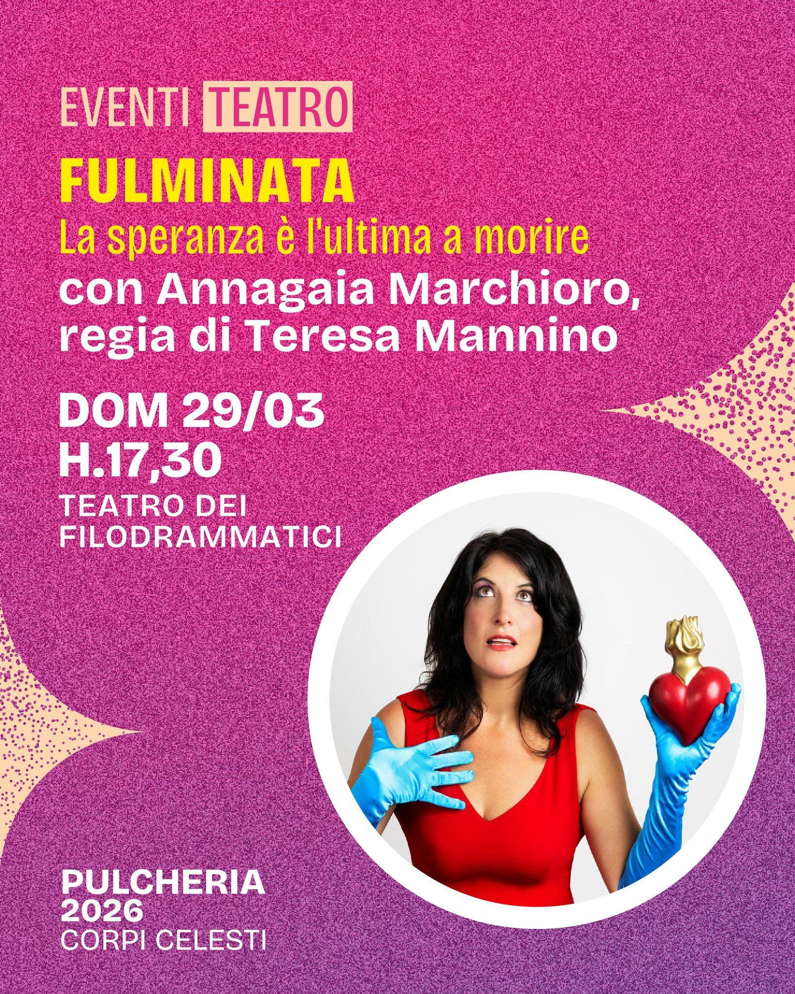 Domenica 29 marzo alle ore 17.30, al Teatro dei Filodrammatici, nell'ambito di Pulcheria 2026 si terrà "Fulminata. La speranza è l’ultima a morire", monologo di Annagaia Marchioro con la regia di Teresa Mannino.