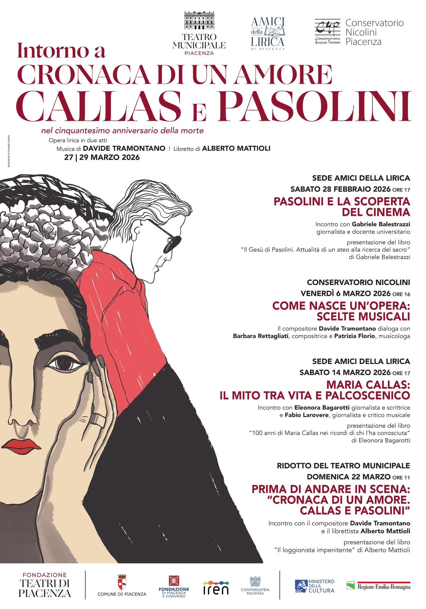 Ad accompagnare l’attesa del debutto, dal 28 febbraio è previsto un ciclo di incontri di approfondimento che indaga le figure di Pasolini e Callas da prospettive storiche, artistiche e musicali. L’iniziativa è realizzata in collaborazione con gli Amici della Lirica di Piacenza e il Conservatorio Nicolini.