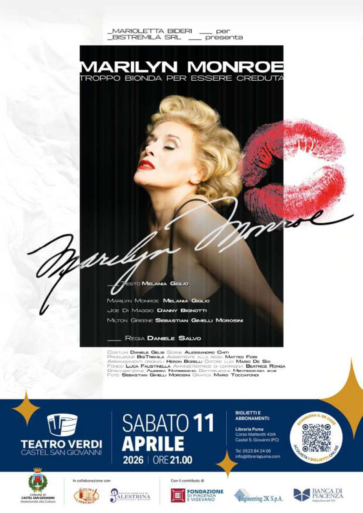 Sabato 11 aprile alle ore 21.00, nell’ambito della Stagione Teatrale 2025/2026, il Teatro Verdi di Castel San Giovanni ospita "Marilyn Monroe – Troppo bionda per essere creduta", spettacolo scritto da Melania Giglio e diretto da Daniele Salvo.