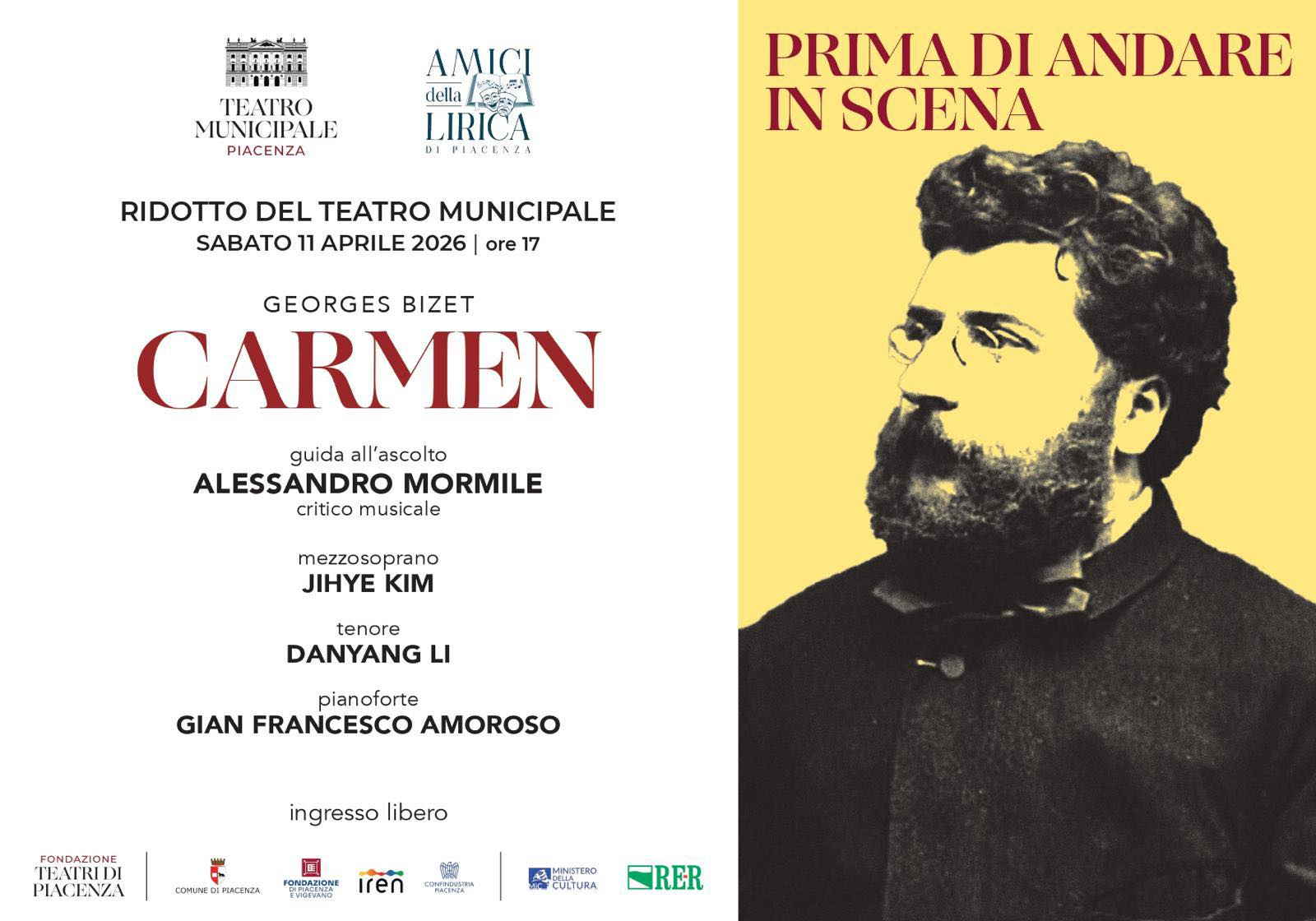 Protagonista dell’incontro sarà Carmen di Georges Bizet, in scena al Teatro Municipale il 17 e 19 aprile. A guidare l’incontro sarà il critico musicale Alessandro Mormile, con la partecipazione del mezzosoprano Jihye Kim e del tenore Danyang Li, accompagnati al pianoforte da Gian Francesco Amoroso.