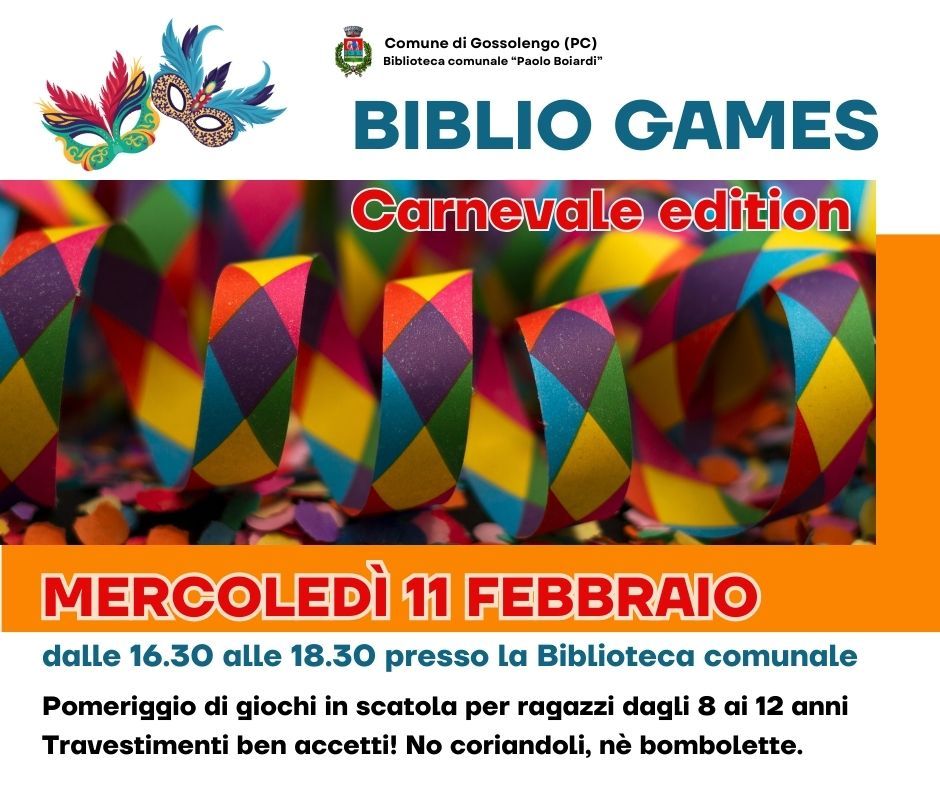 Mercoledì 11 febbraio, a partire dalle ore 16.30, la Biblioteca Comunale "Paolo Boiardi" di Gossolengo apre le porte a un pomeriggio di giochi in scatola dedicato a bambine e bambini dagli 8 ai 12 anni.