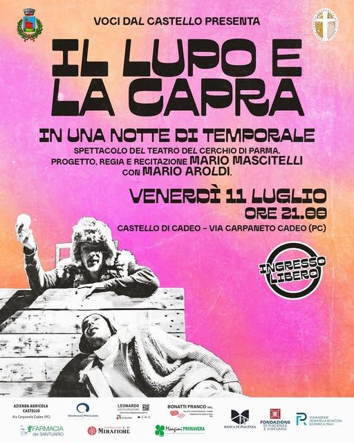 Venerdì 11 luglio, alle ore 21.00, il Castello di Cadeo ospiterà “Il Lupo e la Capra. In una notte di temporale”, spettacolo teatrale del Teatro del Cerchio di Parma, diretto e interpretato da Mario Mascitelli, con Mario Aroldi e la regia assistita da SilviaSantospirito.