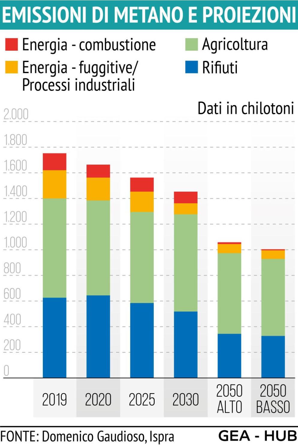 i primi settori per emissioni di metano sono l’agricoltura con il 44,2% e la gestione dei rifiuti con il 37,9%. L’energia pesa per il 17,9%, soprattutto a causa delle perdite e delle fughe che non sarebbero controllate adeguatamente.