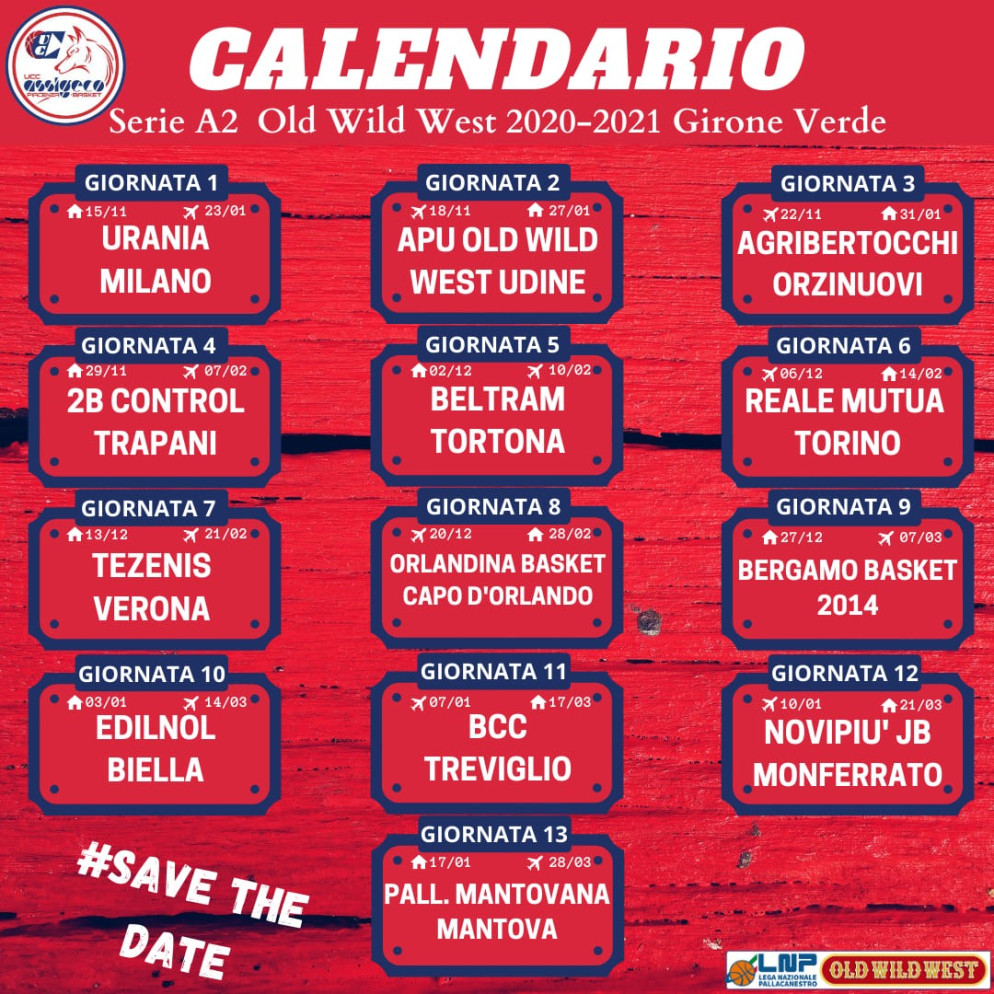 La Lega Nazionale Pallacanestro ha reso noto il calendario del campionato di Serie A2 2020/2021. L’Assigeco Basket Piacenza è stata inserita nel girone verde. L’esordio è previsto in casa, contro l’Urania Milano al PalaBanca nel fine settimana del 15 novembre, gara che precede il primo turno infrasettimanale del 18 novembre sul campo di Udine. La terza giornata vedrà i biancorossoblu ancora in trasferta ad Orzinuovi, prima di due match interni rispettivamente contro Trapani e Tortona (anche quest’ultima gara si disputerà in infrasettimanale il 2 dicembre). La stagione regolare terminerà il 28 marzo quando l’Assigeco andrà a fare visita a Mantova.