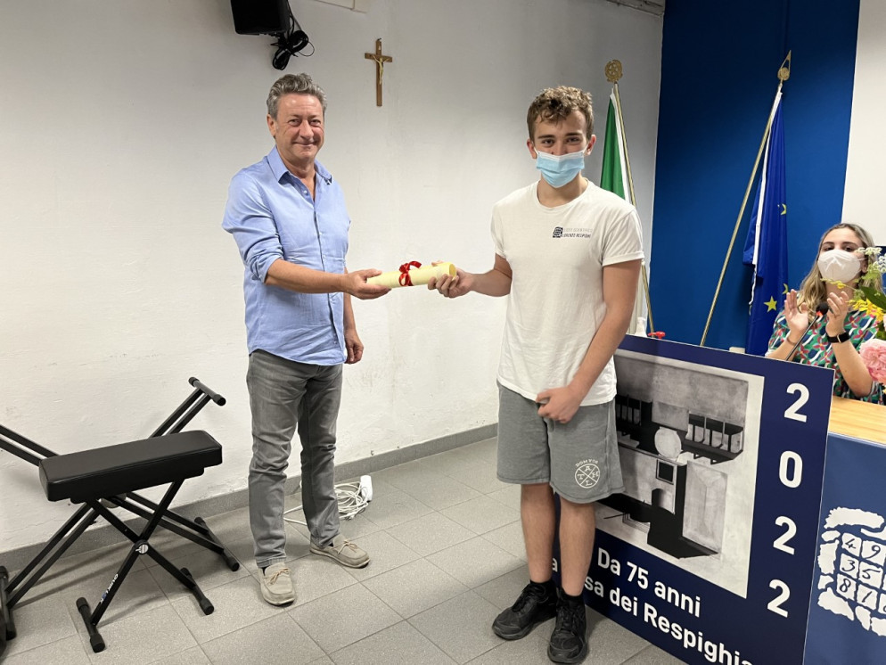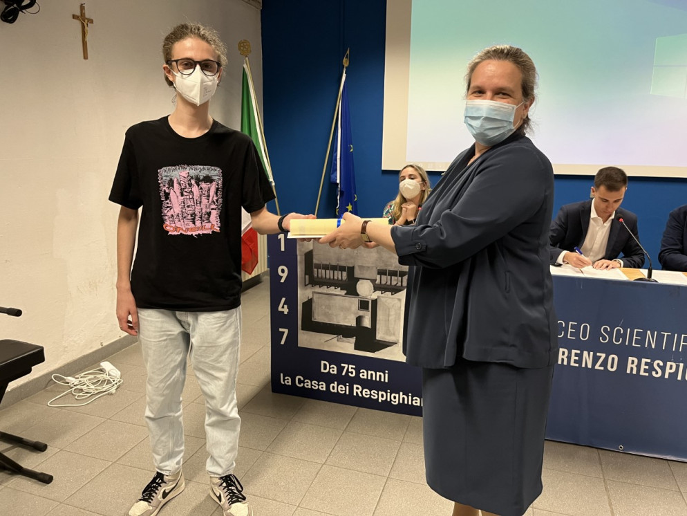 Il riconoscimento è stato consegnato nel corso di una cerimonia svoltasi al Respighi, nella quale sono stati assegnati anche altri premi: la borsa di studio “Ing. Mario Morandi” allo studente Pietro Scaglioni della terza Q e il titolo di Respighiano junior 2022 allo studente Leonardo Maroadi.