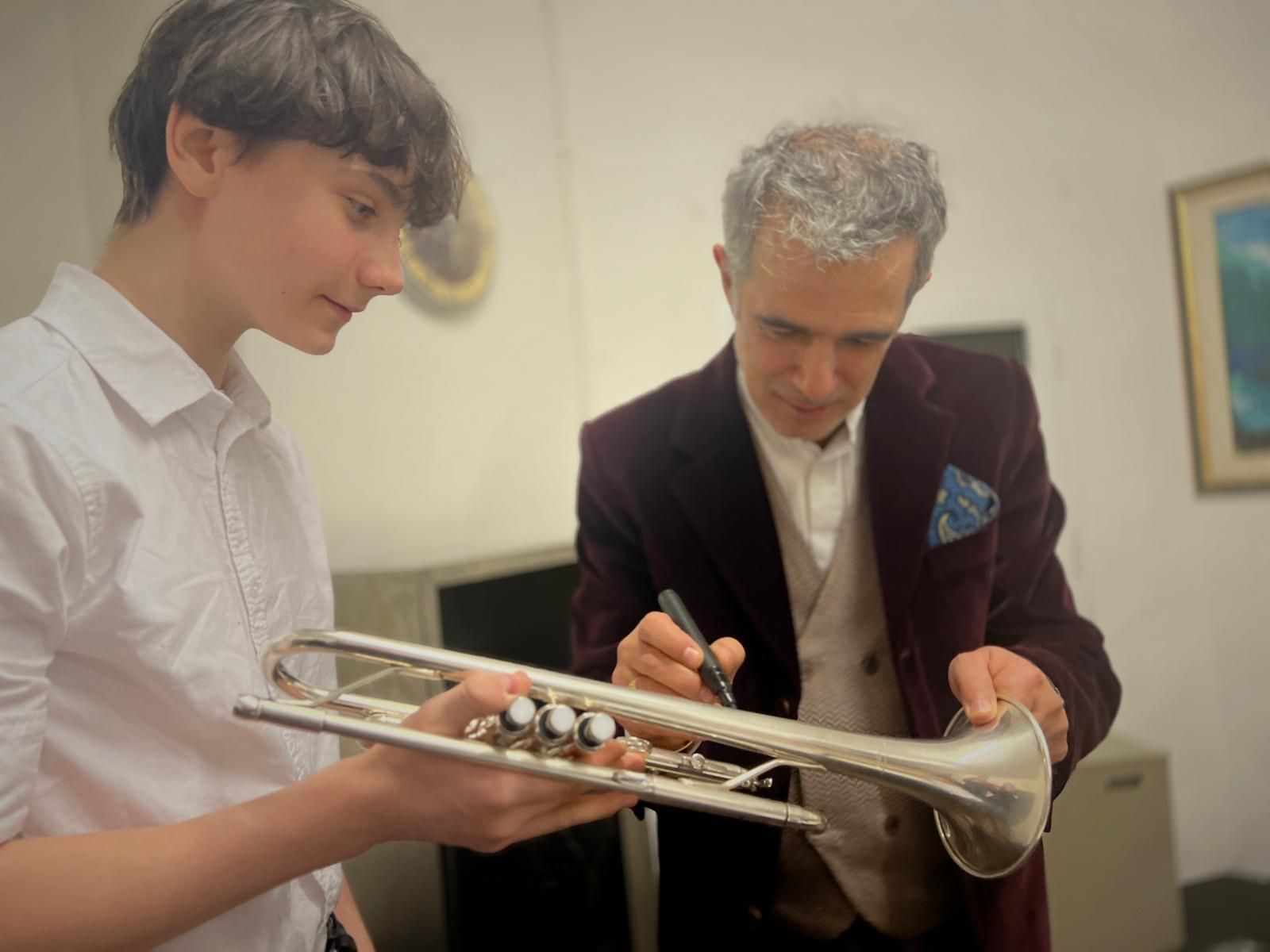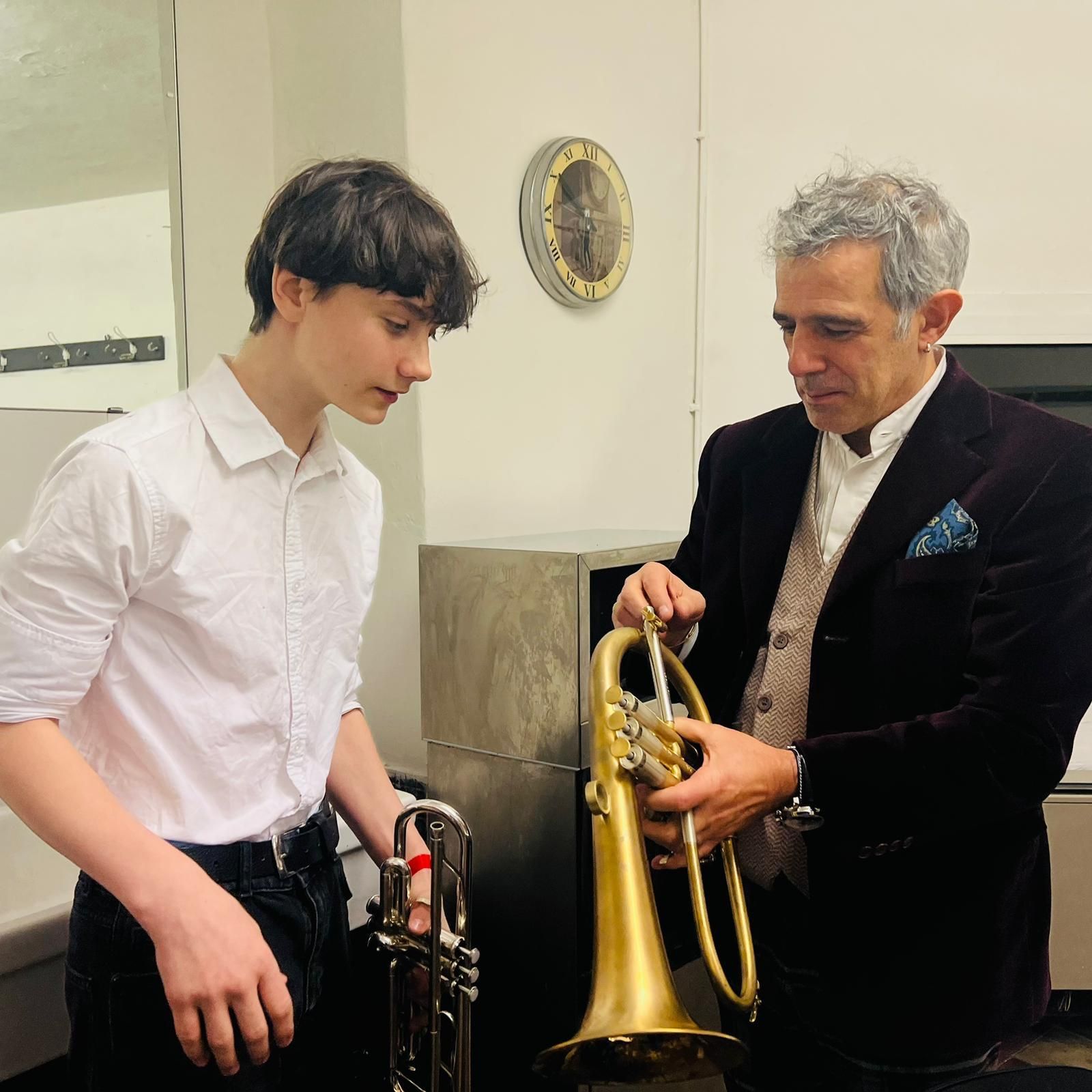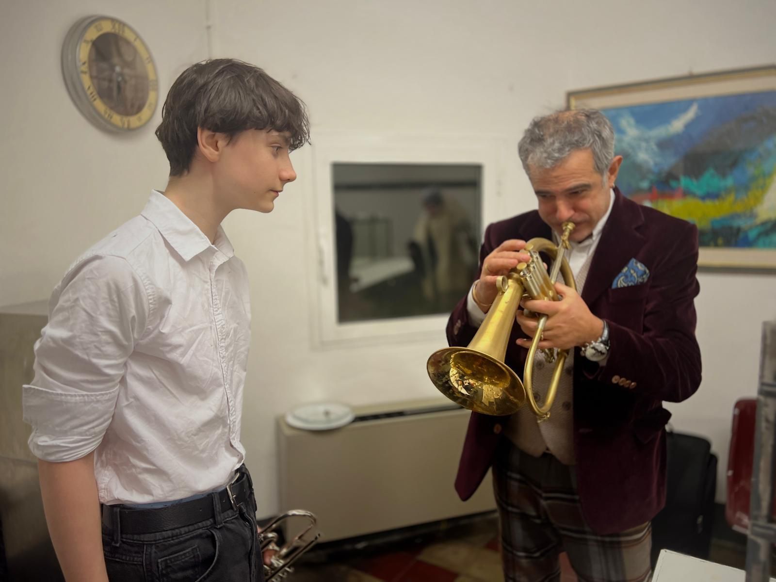 Grazie alla disponibilità degli organizzatori e in particolare di Angelo Bardini, Sebastian ha potuto incontrare Paolo Fresu prima del concerto. Un incontro fatto di parole semplici e di musica: le trombe messe a confronto, Fresu che ascolta il ragazzo suonare, i consigli tecnici, l’incoraggiamento a continuare gli studi. Il gesto di un grande artista che si rivela, prima ancora, una persona capace di attenzione autentica e ascolto vero.
