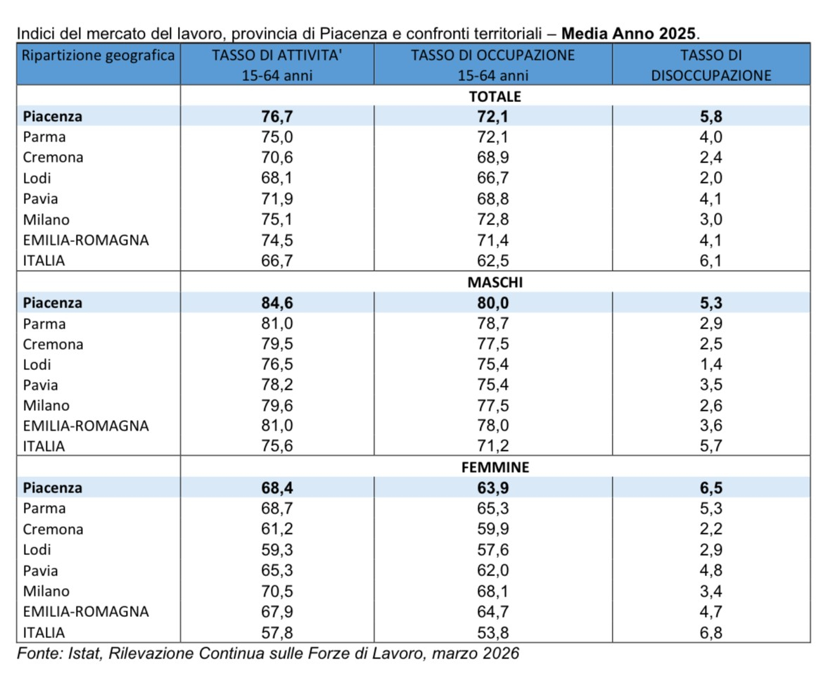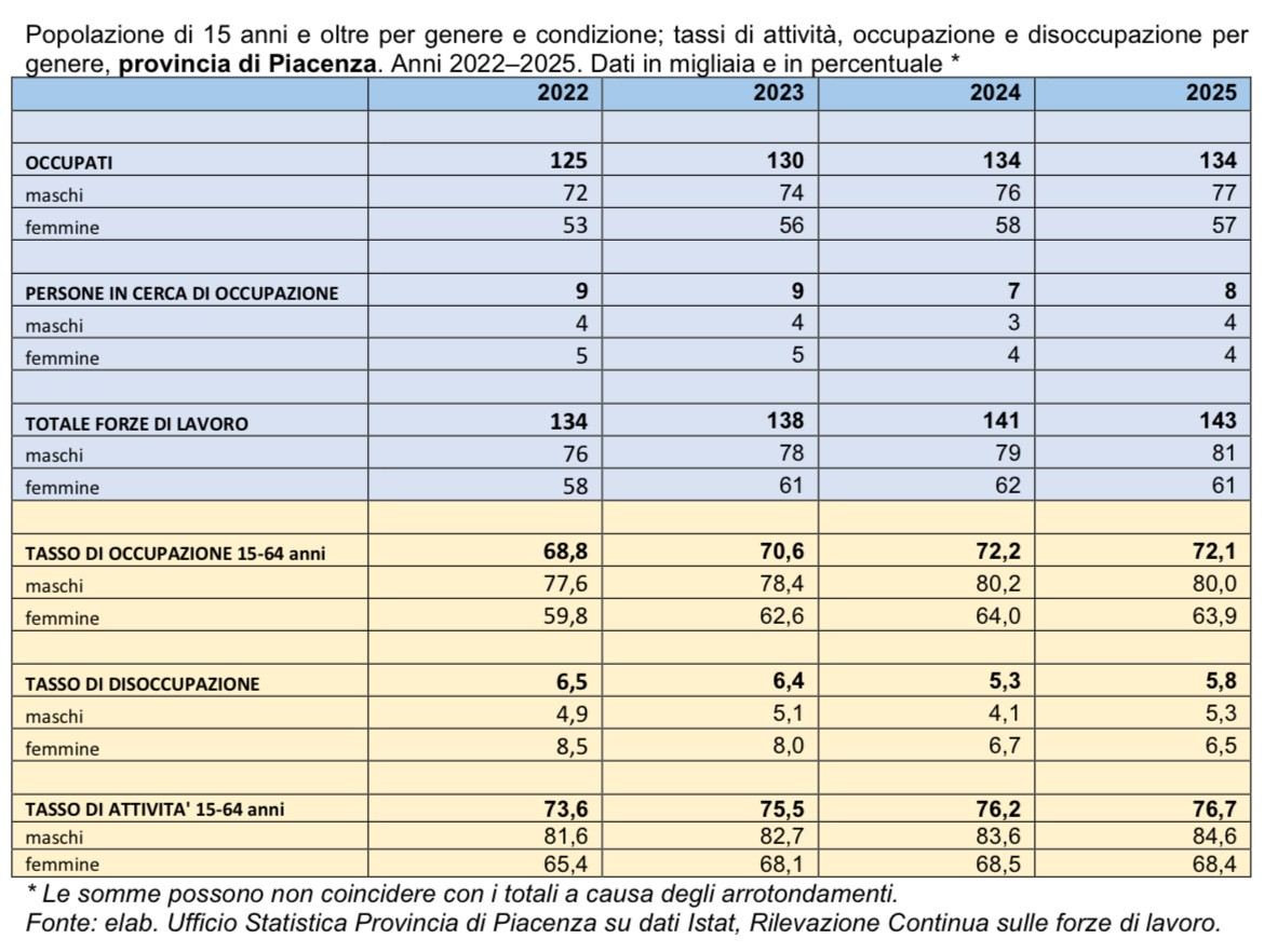 Nel 2025 il mercato del lavoro della provincia di Piacenza mostra segnali contrastanti: l’occupazione resta stabile, ma aumentano le persone in cerca di lavoro. Nonostante ciò, il nostro territorio si conferma tra i migliori in Italia per tasso di attività e livelli occupazionali, con performance particolarmente elevate tra gli uomini. Restano le disparità di genere.