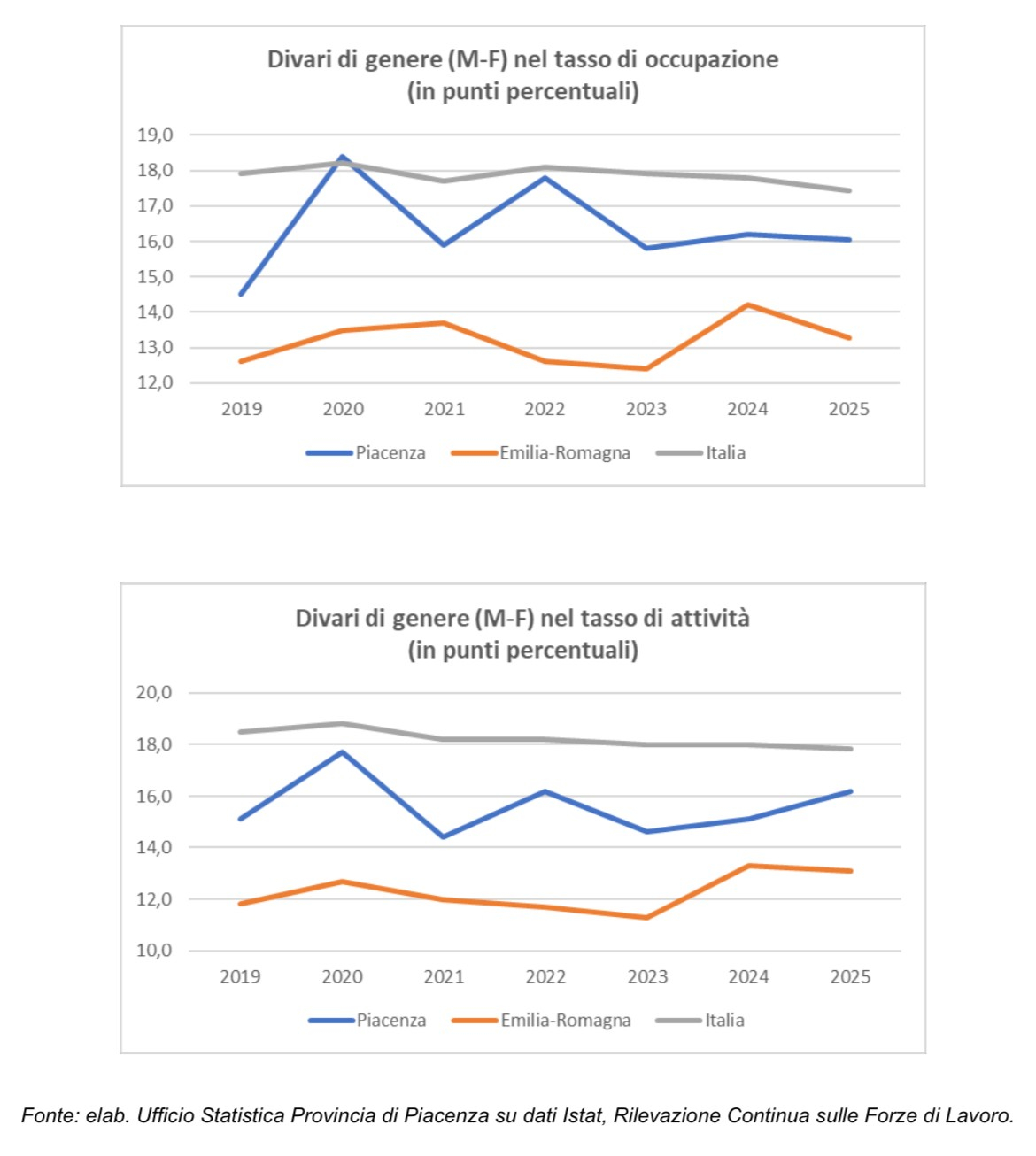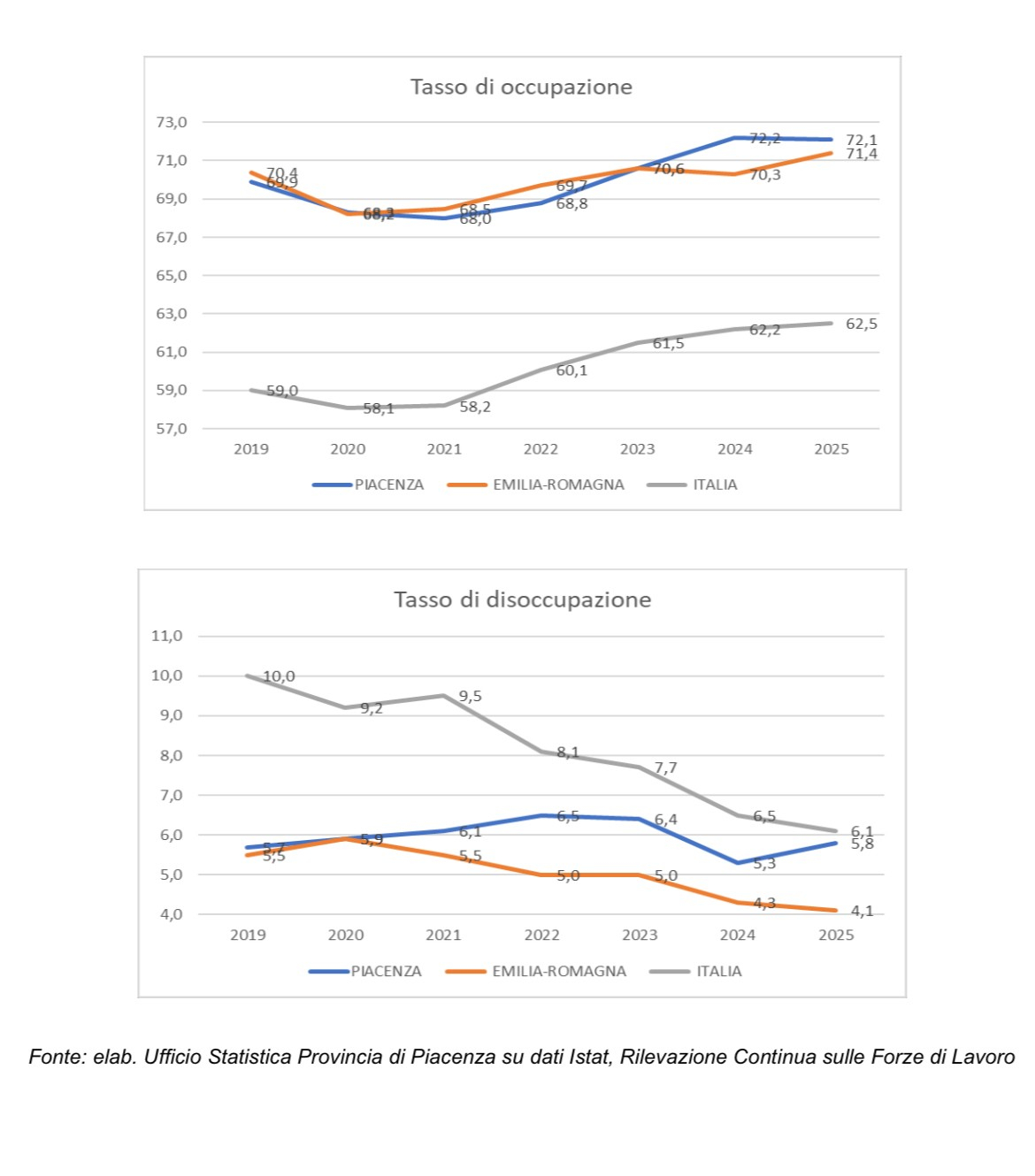 Il 2025 segna quindi una fase di rallentamento per il mercato del lavoro piacentino: si interrompe la crescita degli occupati e aumenta la disoccupazione. Tuttavia, il territorio mantiene indicatori complessivamente solidi e continua a distinguersi a livello nazionale, soprattutto per partecipazione al lavoro e occupazione maschile. Restano però criticità importanti: il divario di genere, il peggioramento della disoccupazione e le difficoltà di alcuni settori produttivi indicano la necessità di politiche mirate per sostenere una crescita più equilibrata e inclusiva.