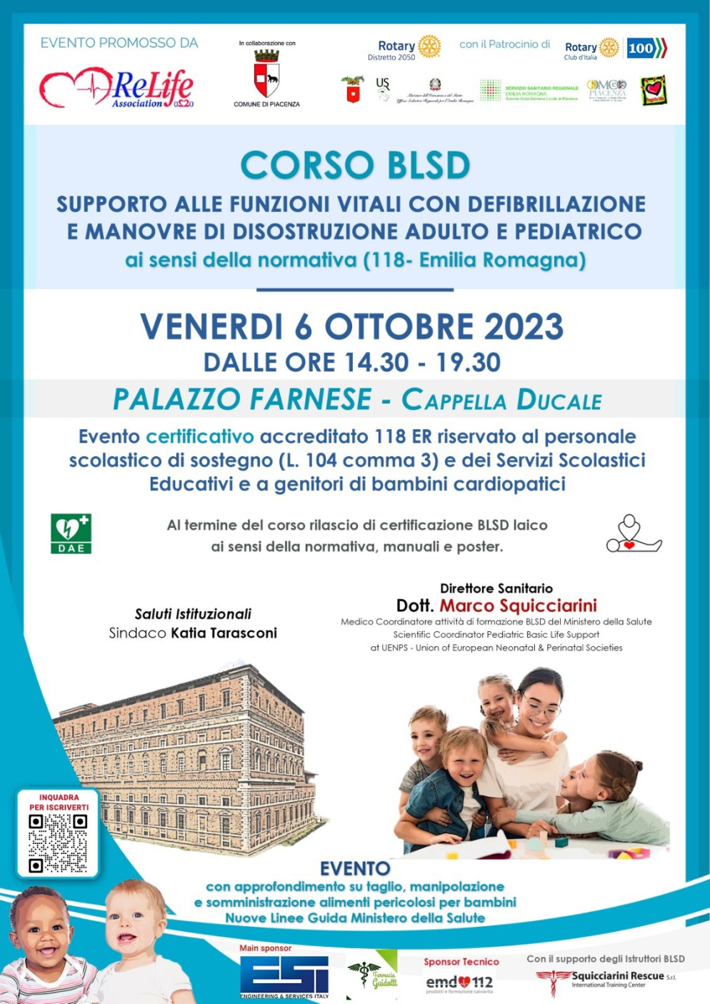 Il 6 ottobre dalle 14.30 alle 19.30, a Palazzo Farnese, verranno certificate alle manovre di rianimazione cardiopolmonare e uso del defibrillatore insegnanti di sostegno di bambini fragili ed operatore scolastici di scuole pubbliche. Il 7 ottobre, a partire dalle 9, nel salone monumentale di Palazzo Gotico, è previsto un corso di manovre di disostruzione e BLS pediatrico rivolto a tutta la cittadinanza, genitori, nonni, baby sitter, animatori, allenatori sportivi. Parteciperanno anche gli alunni delle classi quinte degli istituti superiori ai quali, insieme all’attestato di partecipazione, verranno consegnati crediti formativi da portare all’esame di Stato.