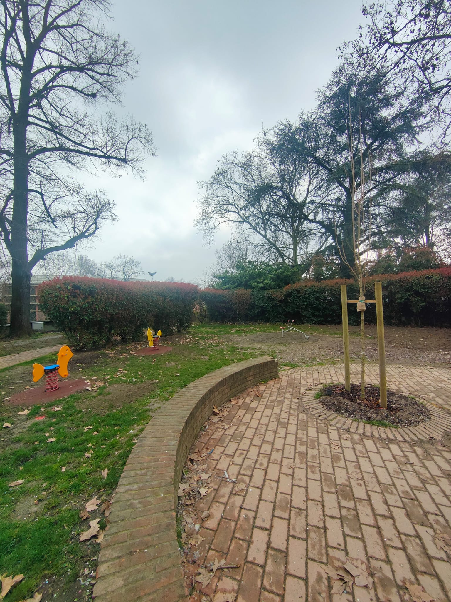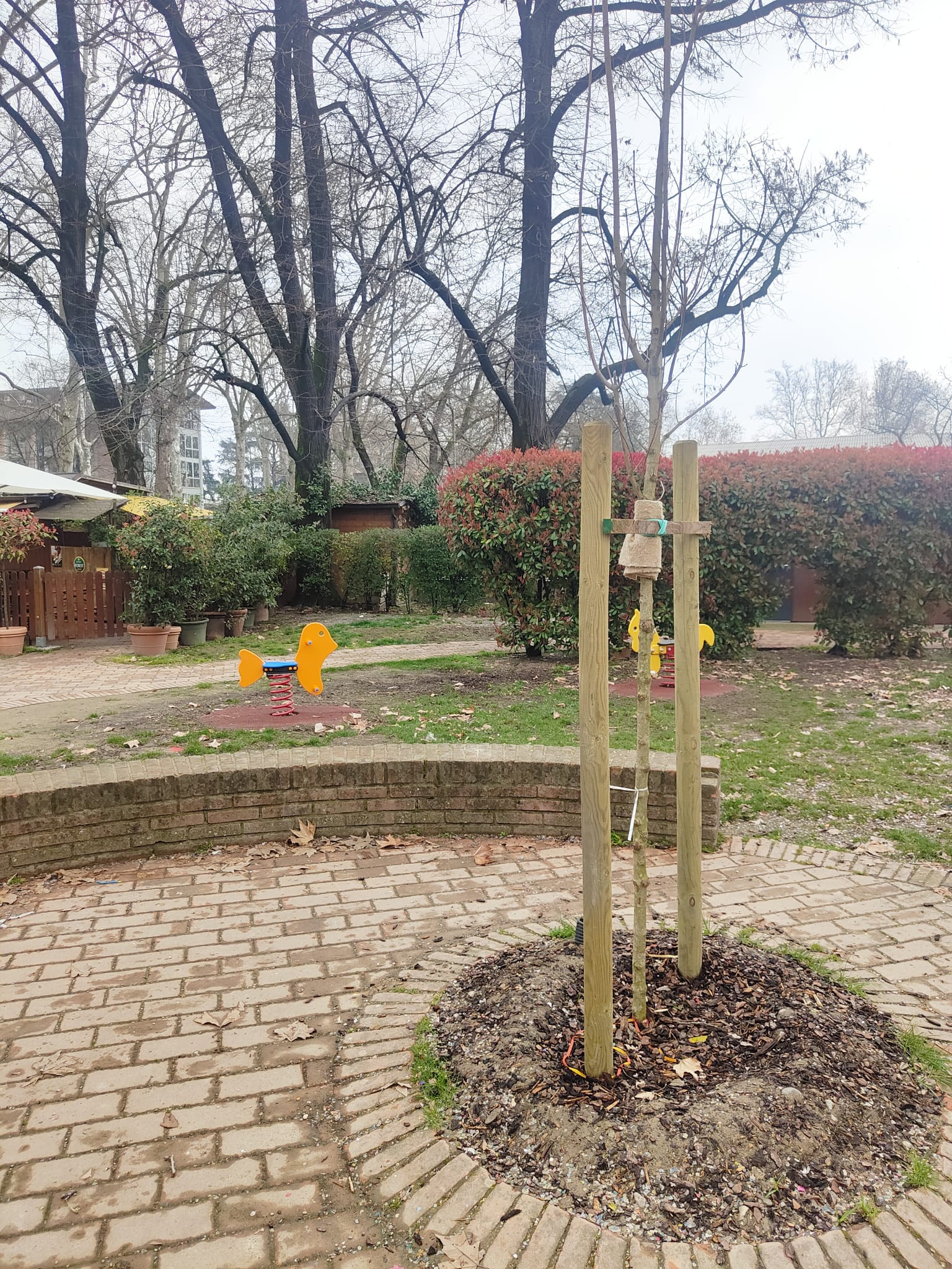 E' stato inoltre piantumato un nuovo albero in una buca di impianto preesistente e si è provveduto alla sistemazione di tavoli e sedie sotto il gazebo, coperto con un telo ombreggiante.