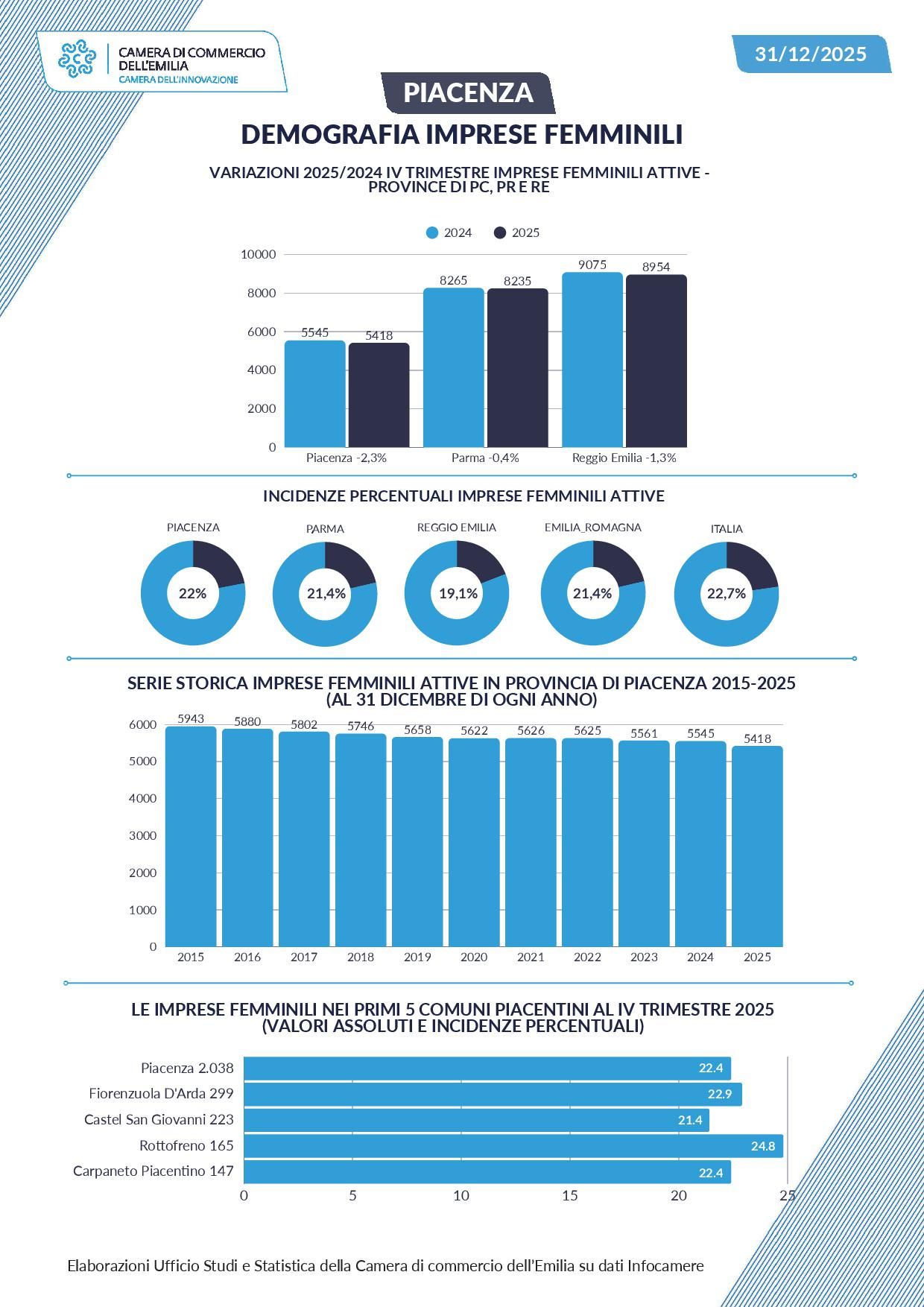 Sono scese a 5.418 unità le imprese femminili attive in provincia di Piacenza alla fine del 2025, con una contrazione del 2,3% che risulta di due punti superiore al -0,3% già registrato nel 2024. Nonostante la flessione, che determina un saldo con 127 imprese «in rosa» in meno, Piacenza conserva la prima posizione, nell’area vasta dell’Emilia Occidentale, per l’incidenza delle imprese femminili sul totale delle attività imprenditoriali attive, attestata al 22,0% e, conseguentemente, anche al di sopra della media regionale del 21,4%.