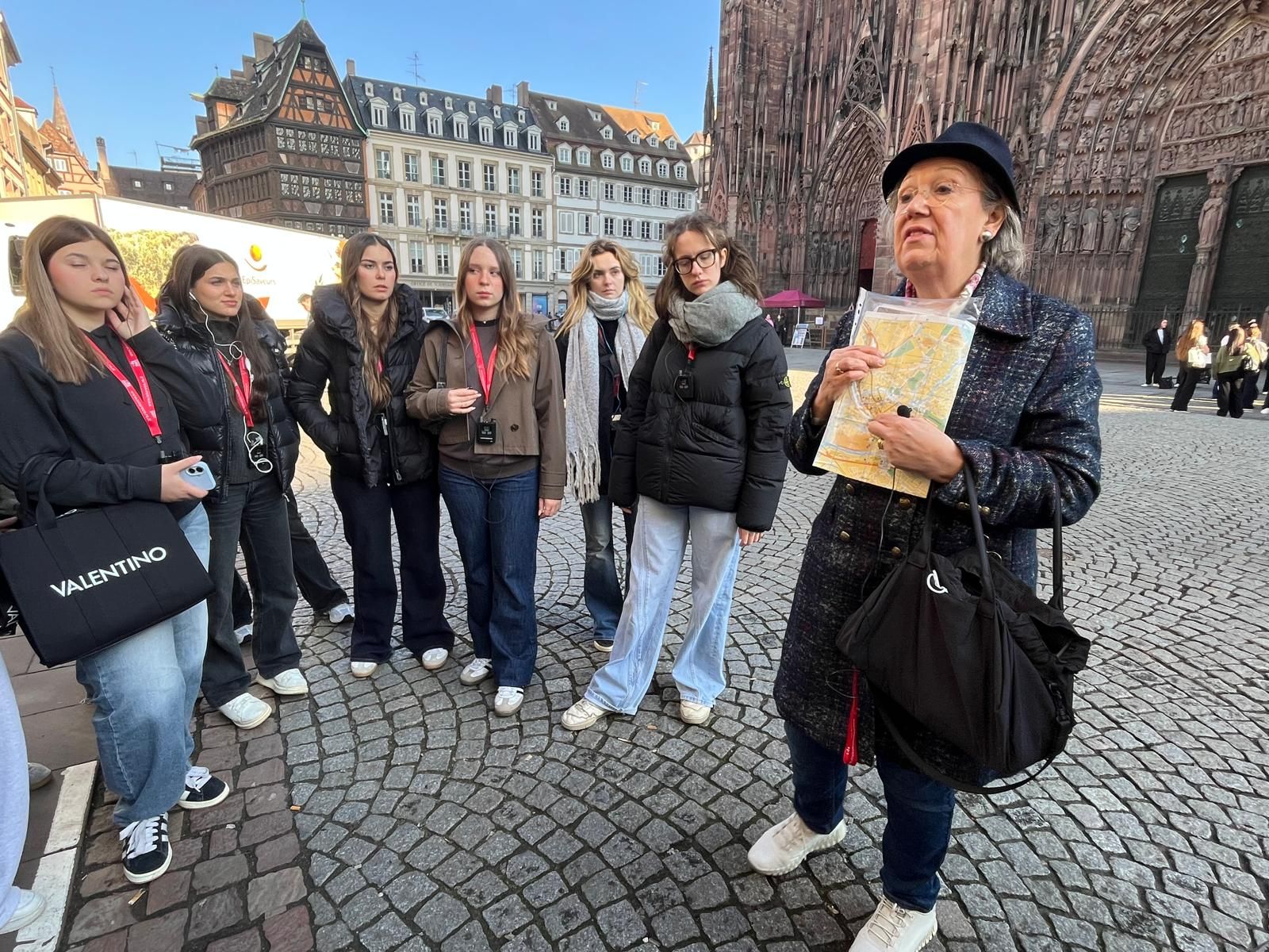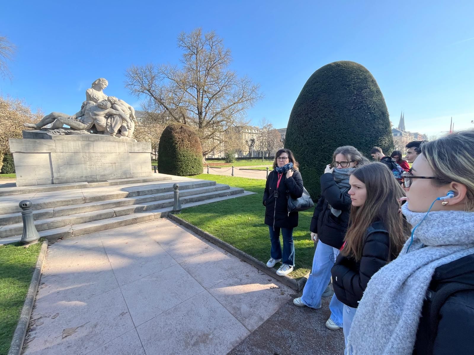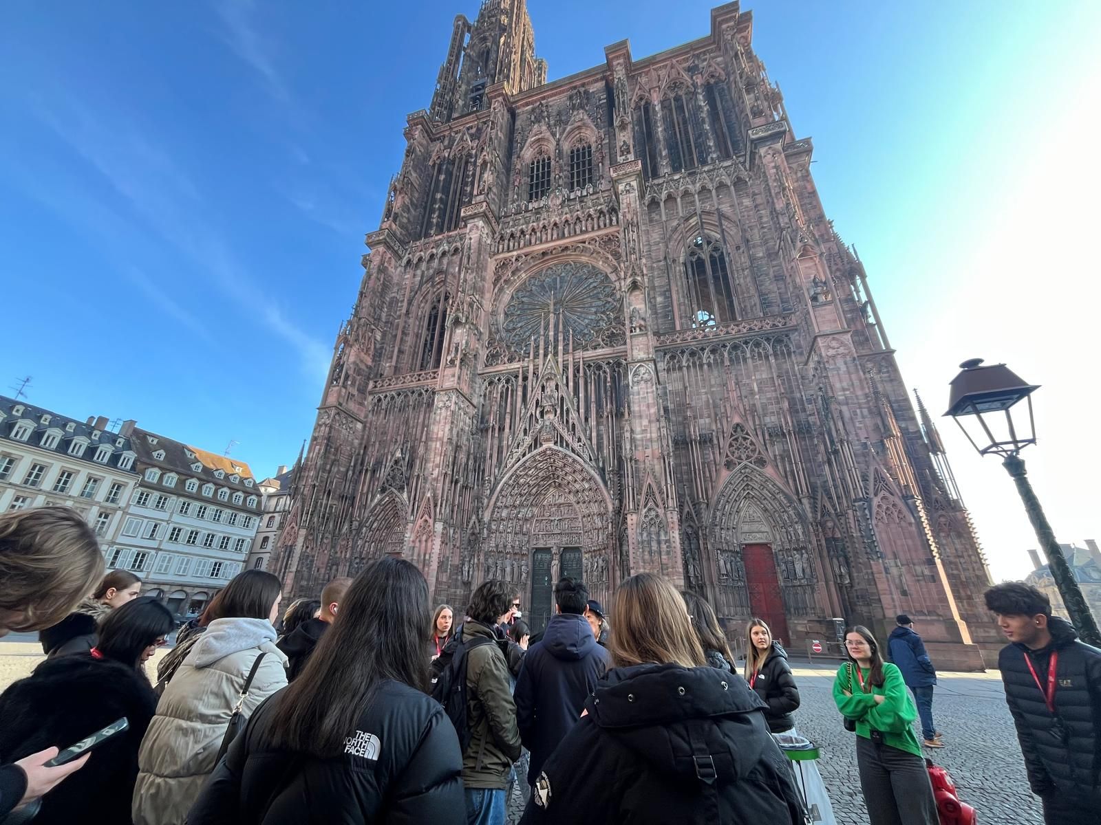 Alla mattina invece, accompagnati dalle guide Fioralba e Valerie, i ragazzi sono andati alla scoperta della storia di Strasburgo, fondata nel 12 a. C. dai romani. Per otto secoli terra germanica, nel 1681 diventa francese, restandolo fino al 1870. Poi è ancora tedesca fino al 1918, francese fino al 1940, poi di nuovo è occupata dai tedeschi fino alla fine della guerra. Questi passaggi non restano solo scritti nella storia con la S maiuscola, ma sono impressi nelle storie piccole di chi ha abitato questi luoghi, nelle architetture, persino nei monumenti, nelle case a graticcio che ci spiegano essere smontabili, nel quartiere Petit France dove venivano confinati i malati di sifilide, nella statua dedicata ai “nostri morti” e non ai caduti per la patria perché la patria continua a cambiare.