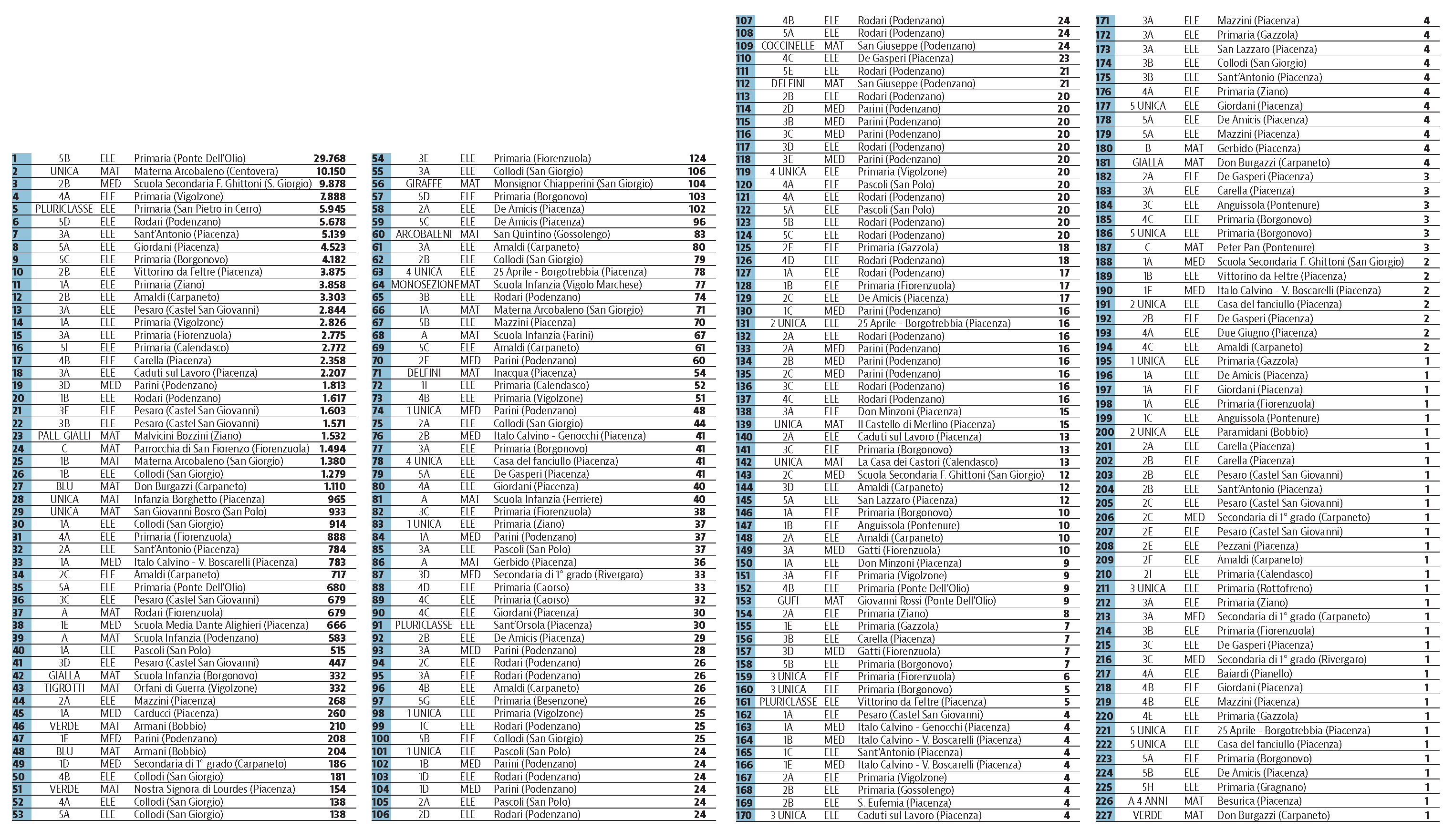 Il nuovo aggiornamento della graduatoria evidenzia un dato interessante: rispetto all’ultima classifica, le prime dieci posizioni restano invariate. Saldamente in testa ancora la 5ªB della Primaria di Ponte dell’Olio, la sezione unica della Materna Arcobaleno di Centovera, la 2ªB della Secondaria Ghittoni di San Giorgio, solo per limitarci a citare il podio.