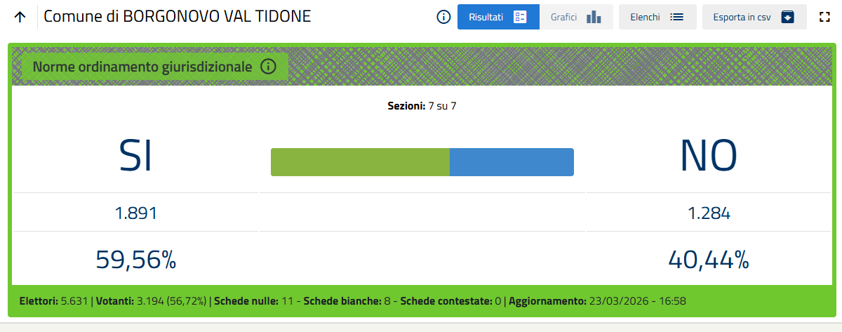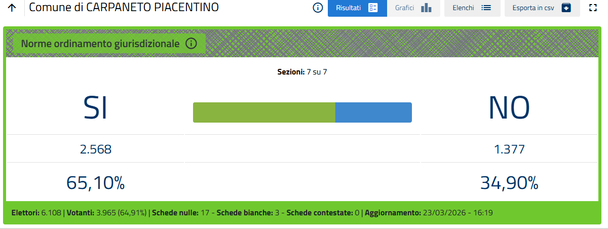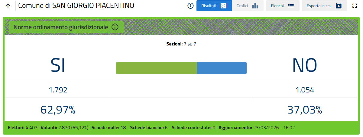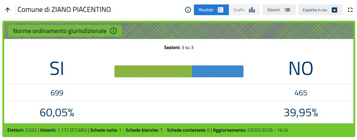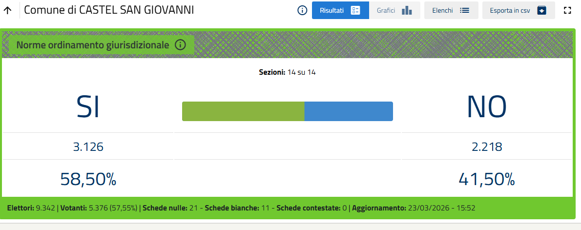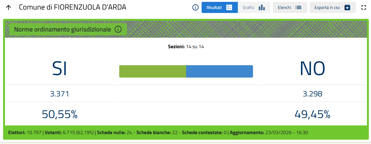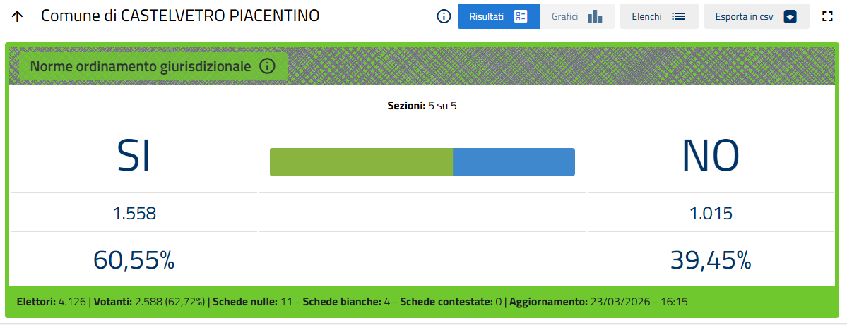 Nella sola città di Piacenza le percentuali definitive sono Sì 51,26%, No 48,74%.