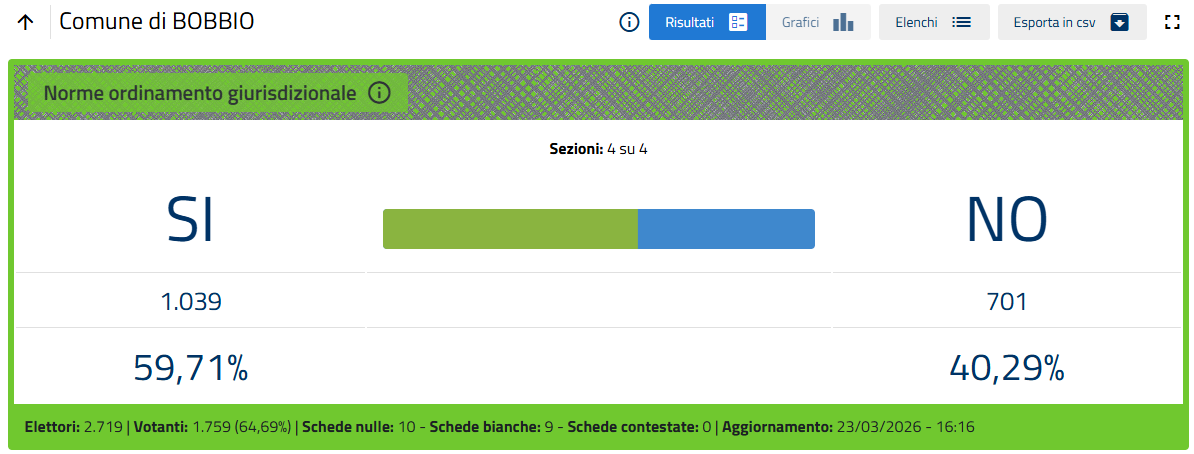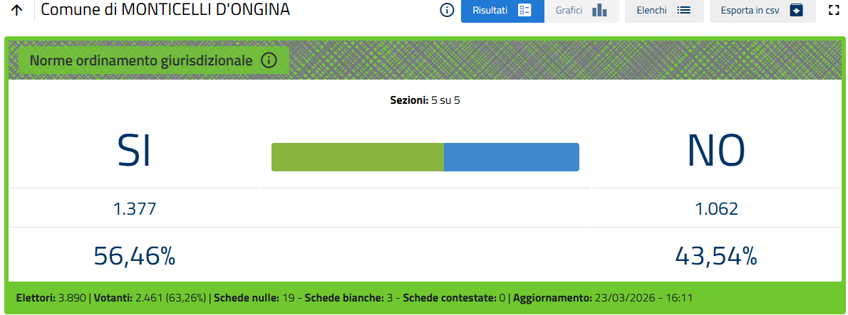 Nel Piacentino lo spoglio delle schede nelle 299 sezioni è terminato, determinando la vittoria del Si per il 56,16% contro il 43,84% del No.