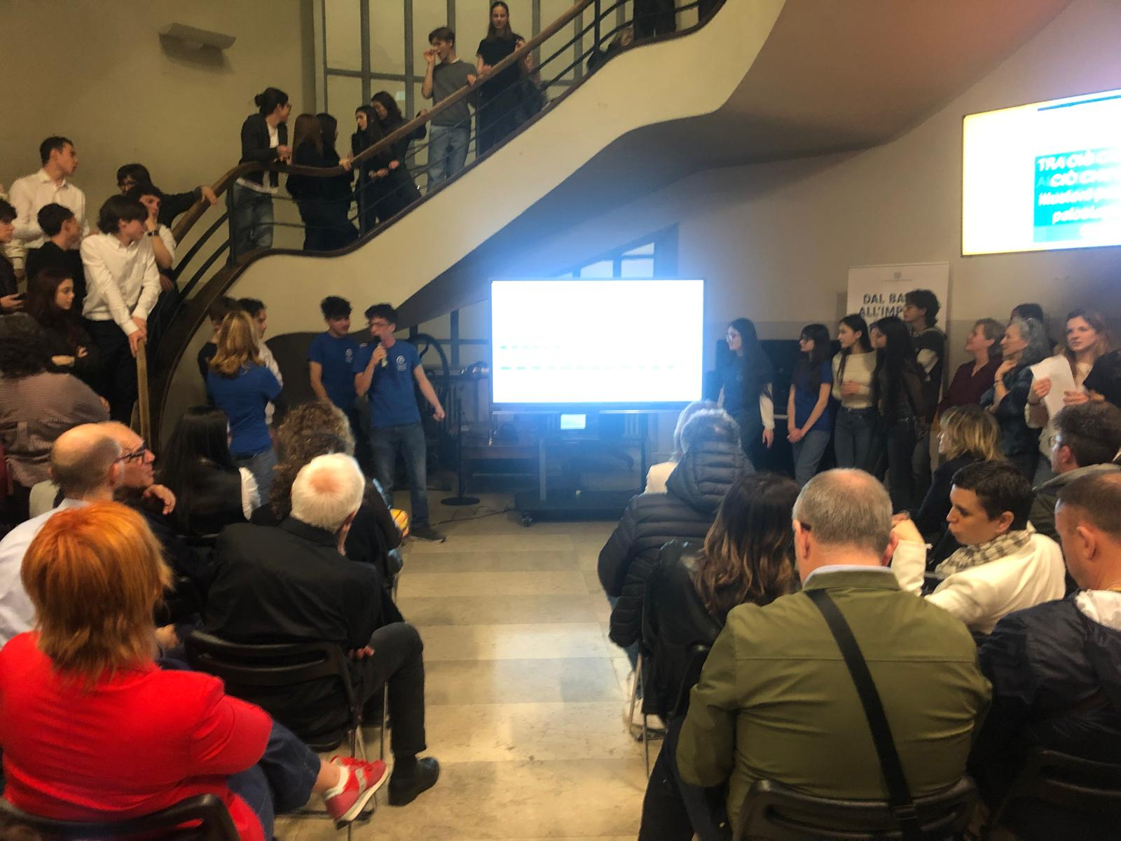La serata è cominciata alle 20.30, con una folla di persone nell’atrio principale: dove attraverso uno schermo, hanno potuto seguire diversi problemi di matematica presentati dai ragazzi. Il pubblico è stato così coinvolto dagli stessi studenti e spronato a trovare la soluzione. La partecipazione è stata notevole, e genitori e parenti che non avevano studiato matematica sono riusciti a risolvere molti dei problemi presentati dai ragazzi in tempi rapidi e senza commettere errori.