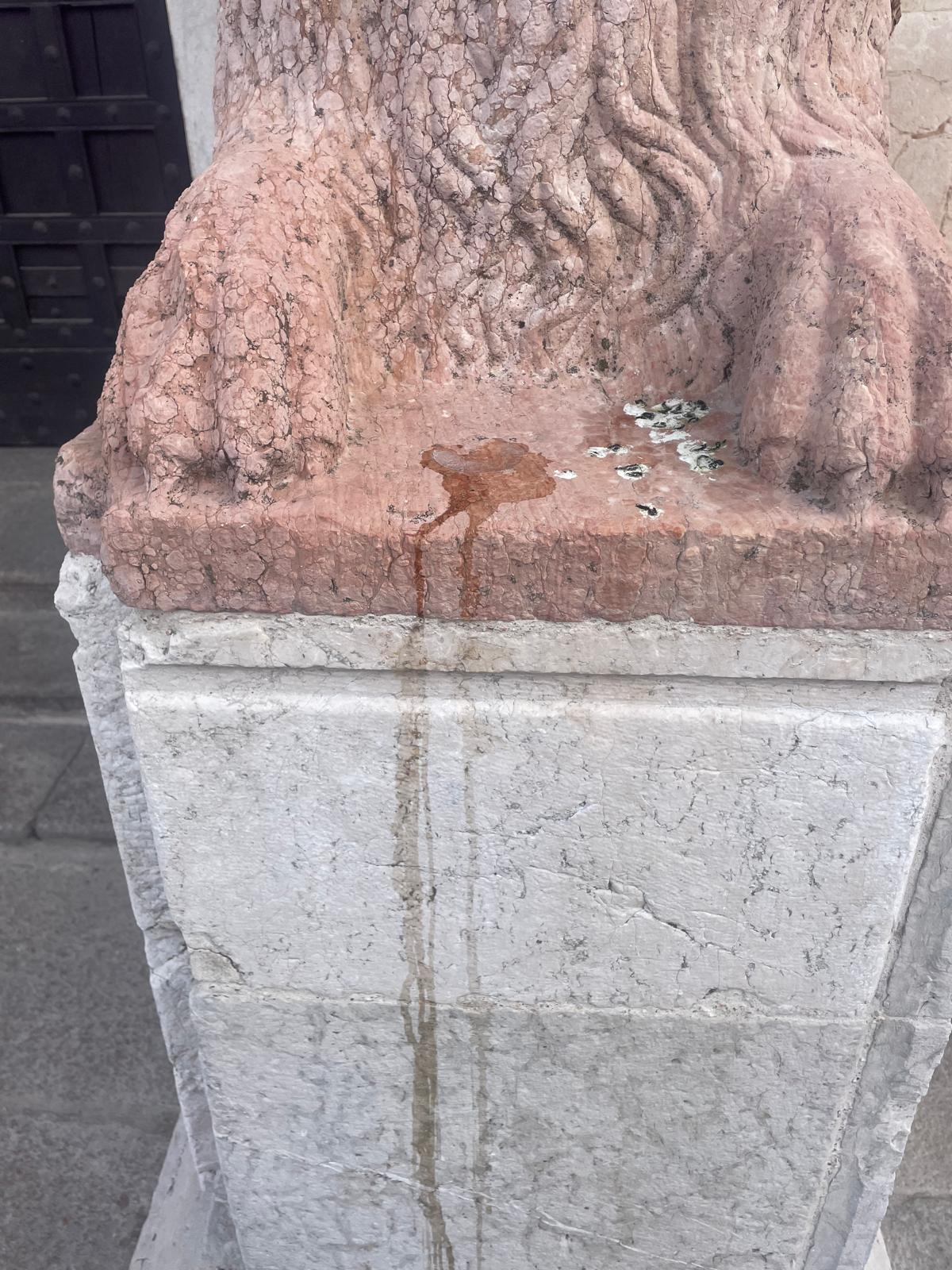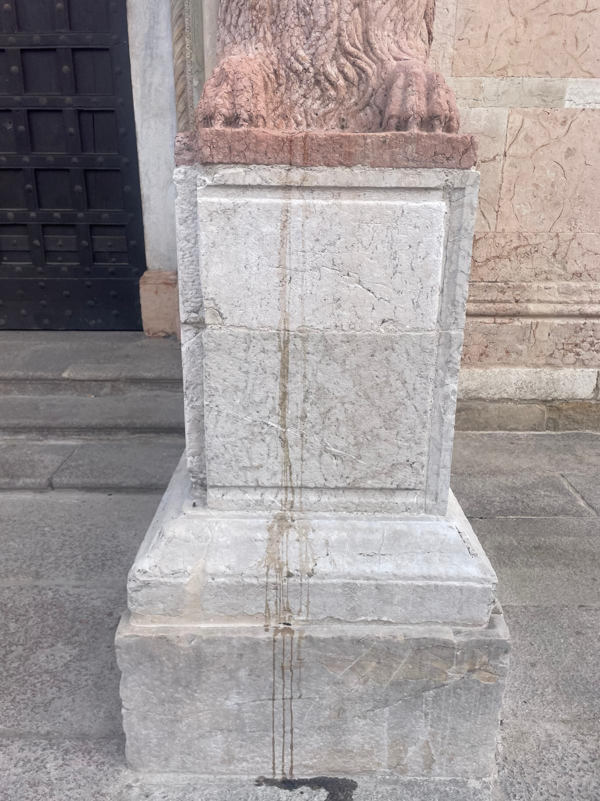 Un bicchiere di vodka abbandonato sul basamento del leone, con il liquido colato lungo la pietra chiara fino a lasciare una traccia visibile. Poco distante, chiazze di gelato sciolto sul selciato. E poi aloni e macchie lasciate dai cani, o meglio dall’incuria dei loro padroni. È questa la scena che si presenta davanti alla facciata del Duomo di Piacenza, da poco restituita alla città dopo un lungo e accurato restauro.