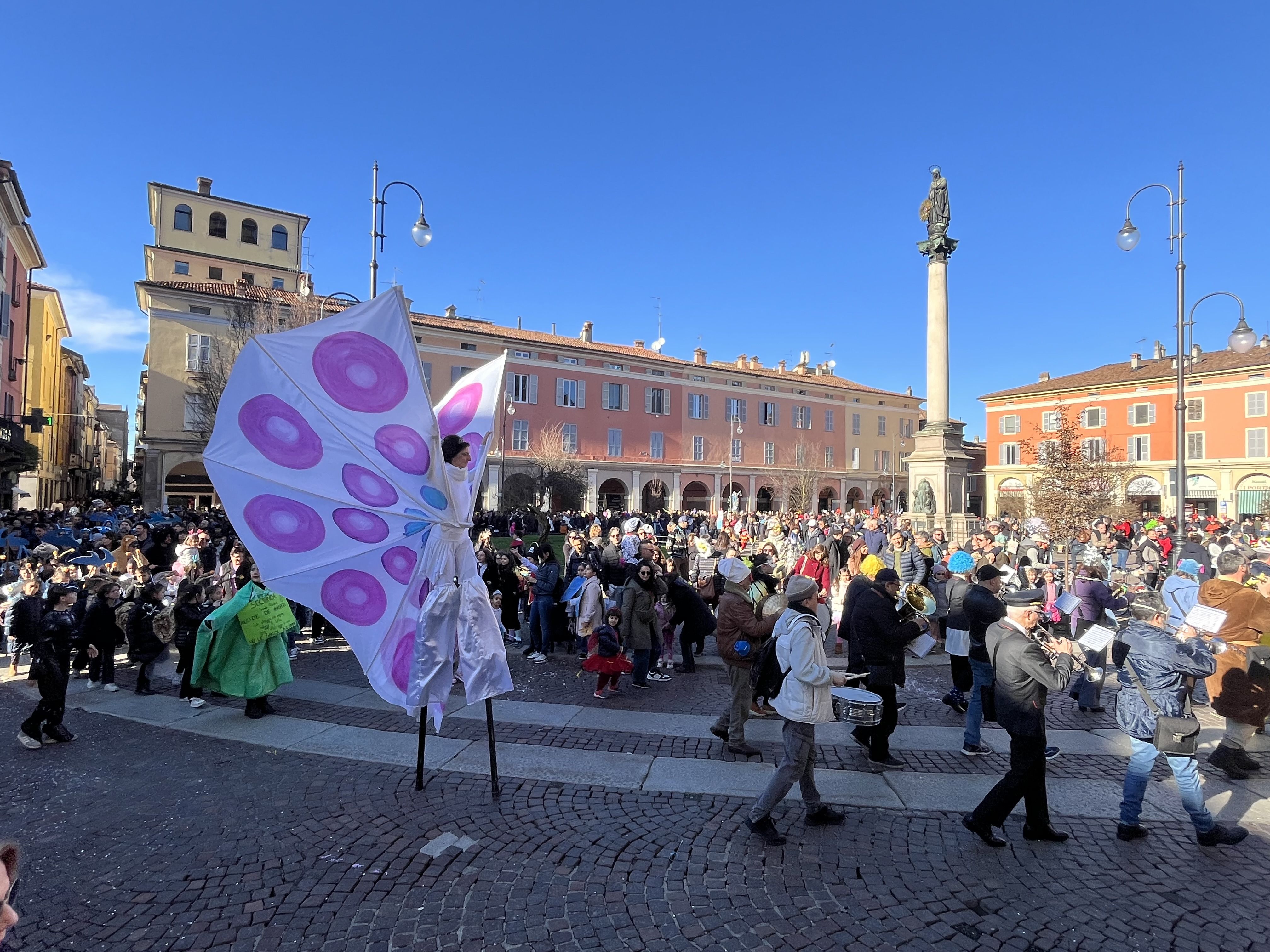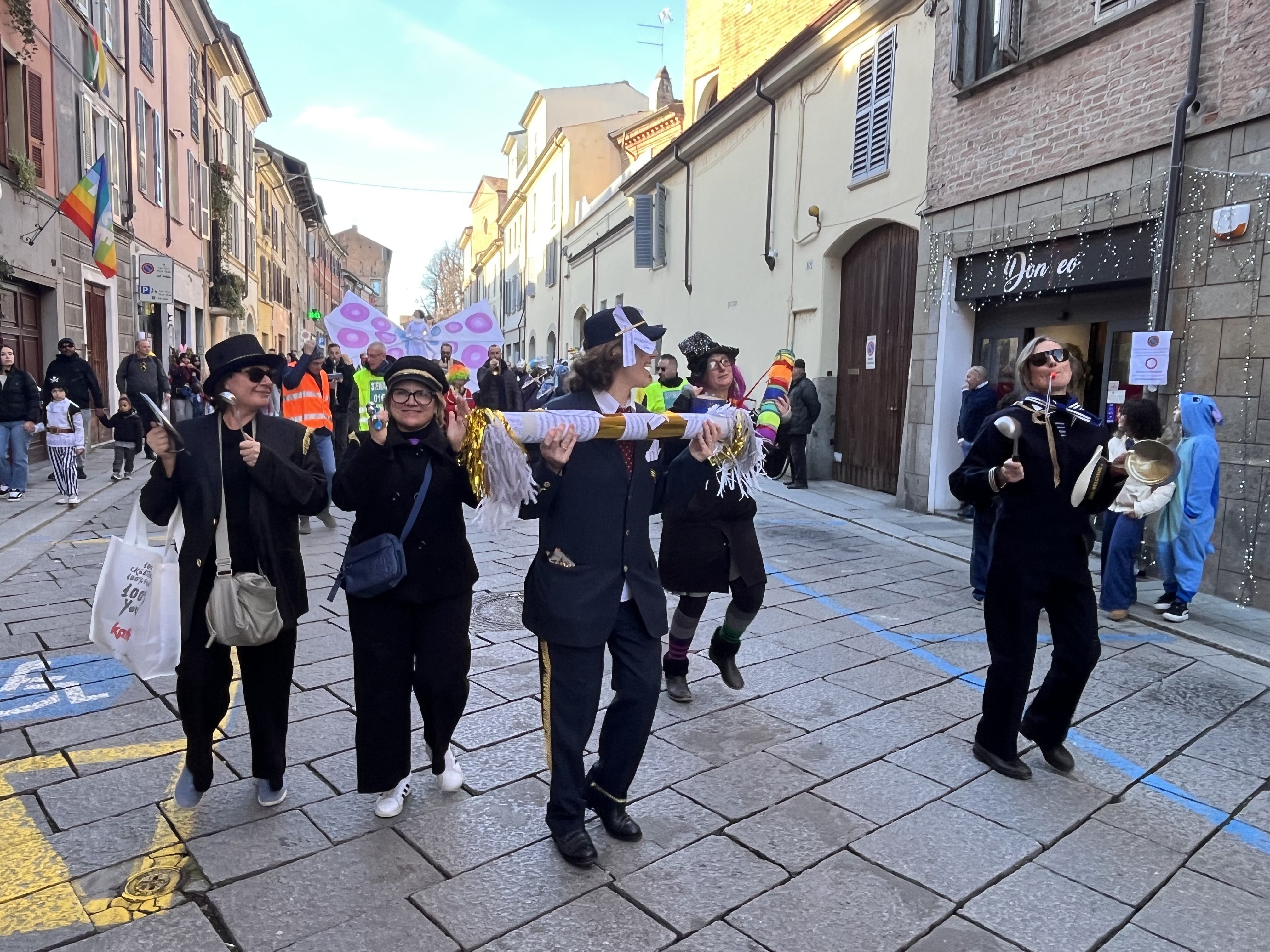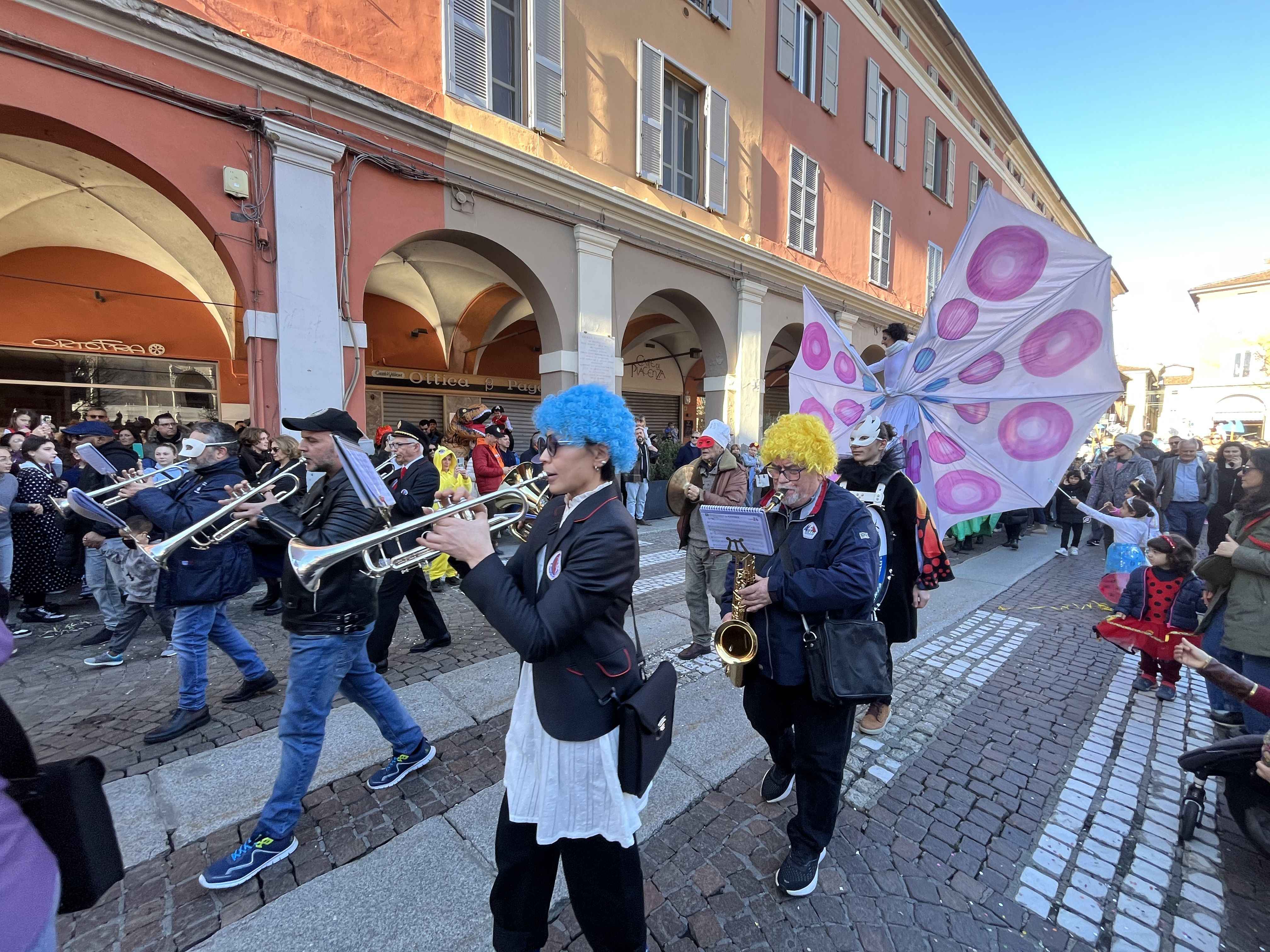 C’è una banda matta di galera che suona latte di pomodoro e impugna bastoni della pioggia con le stelle filanti davanti al corteo che svolta verso via Roma. Dietro sfila almeno un migliaio di persone: una banda vera come la Ponchielli, poi bambini e genitori, ma anche tanti adulti che hanno raccolto l’invito a partecipare al Carnevale di Piacenza che il Comune e l’Associazione Quartiere Roma hanno organizzato in collaborazione con diverse realtà del territorio (Centro per le famiglie, Velolento, Spazio 4, Rathaus, Ciclofficina Pignone, Stampone, Corona Events e Iren).