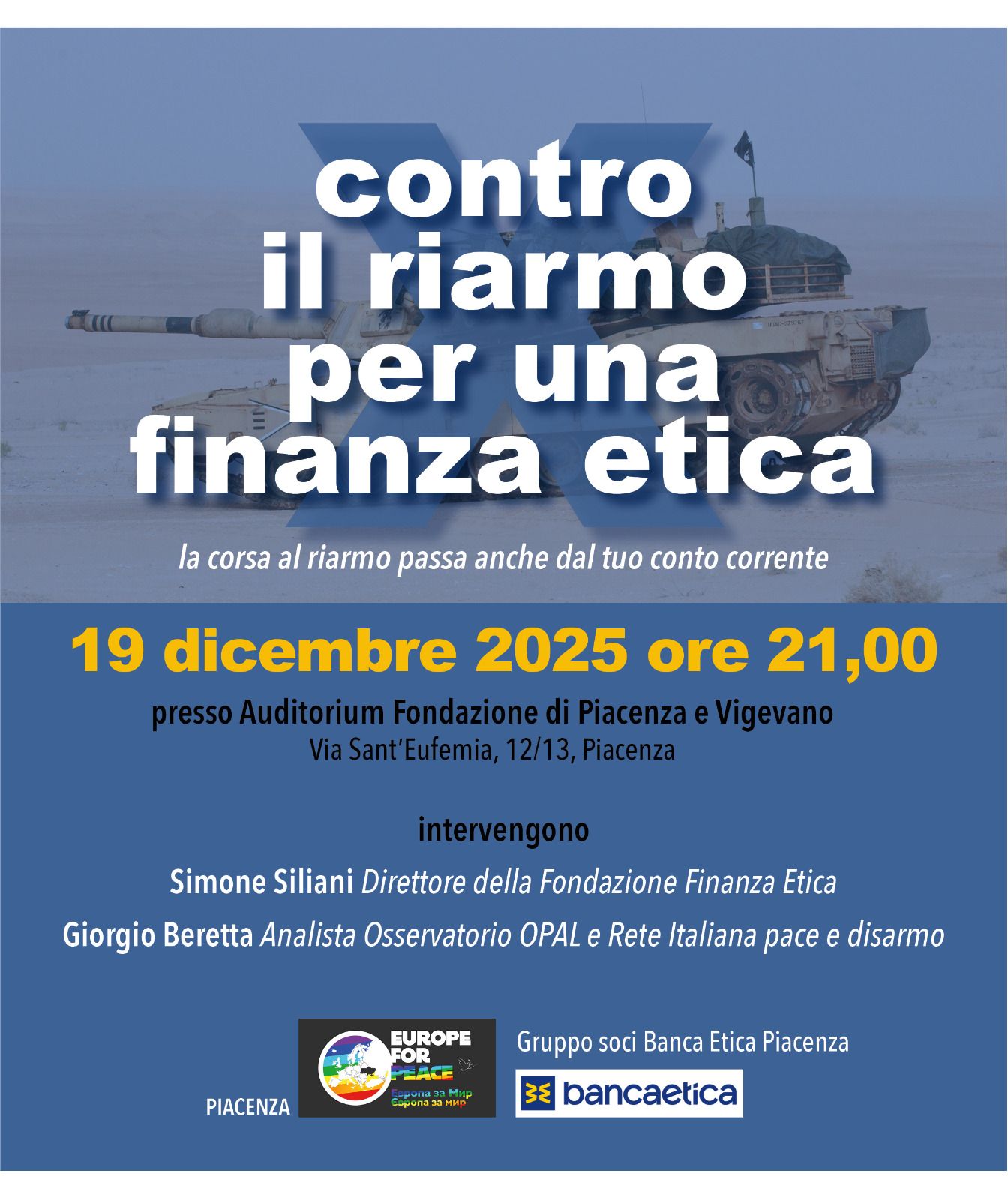 L’iniziativa “Contro il riarmo per una finanza etica - la corsa al riarmo passa anche dal tuo conto corrente”, promossa dalla rete “Europe for Peace-Piacenza” e dal gruppo territoriale dei soci di Banca Etica, il 19 dicembre alle ore 21 presso l’Auditorium della Fondazione di Piacenza e Vigevano, si propone di approfondire aspetti di questo importante tema di grande attualità e di dare voce alle proposte concrete di chi vuole boicottare l’aumento delle spese militari anche attraverso la possibilità di scelte personali alternative che esistono e non sempre sono conosciute.