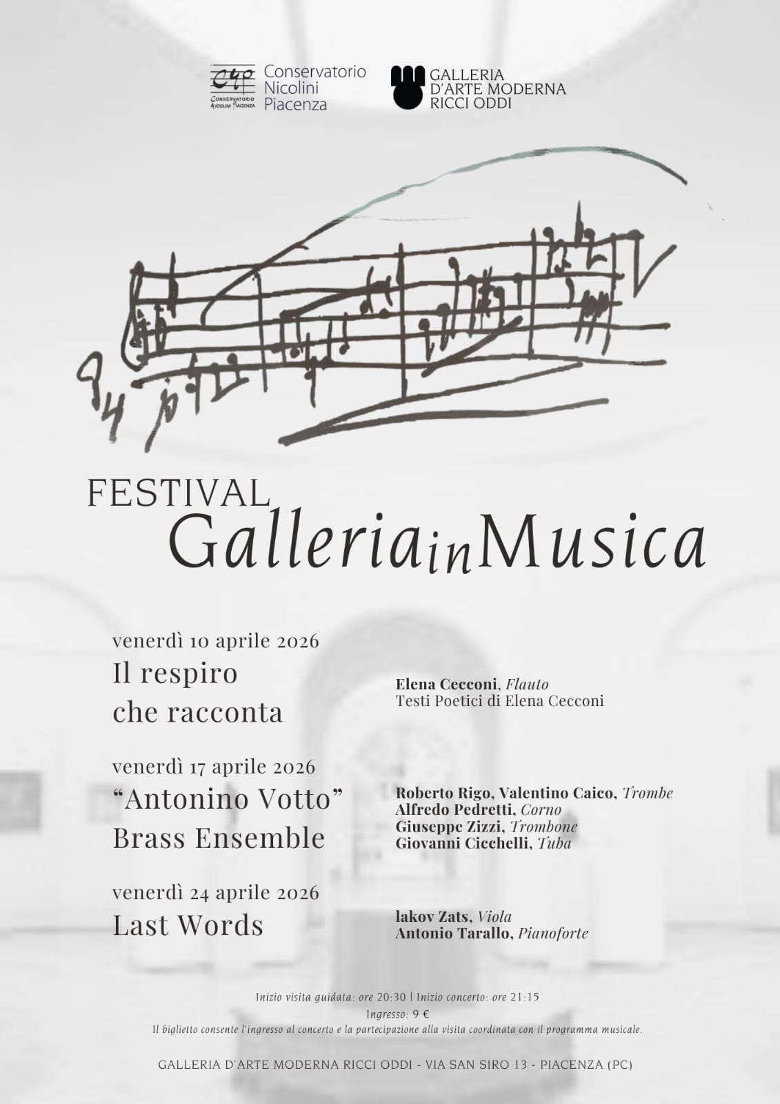 Le serate prendono avvio alle ore 20:30 con la possibilità, per chi lo desidera, di partecipare a un percorso guidato tra le opere della Ricci Oddi: un itinerario di visita pensato come introduzione ai temi e alle suggestioni del concerto in programma. Le esecuzioni musicali avranno inizio alle ore 21:15. Ad aprire la rassegna, venerdì 10 aprile, sarà Il respiro che racconta, con la flautista Elena Cecconi, protagonista in una doppia veste di musicista e poetessa. Venerdì 17 aprile sarà la volta dell’Antonino Votto Brass Ensemble, con le trombe di Roberto Rigo e Valentino Caico, il corno di Alfredo Pedretti, il trombone di Giuseppe Zizzi e la tuba di Giovanni Cicchelli. La rassegna si concluderà il 24 aprile con Last Words, affidato al duo composto da Iakov Zats (viola) e Antonio Tarallo (pianoforte). Il costo del biglietto di ingresso è di 9 €, comprensivo di visita guidata e concerto.
