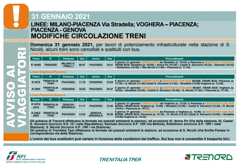 Domenica prossima, 31 gennaio, la stazione di San Nicolò sarà interessata da alcuni lavori di potenziamento infrastrutturale: diversi treni delle linee Milano-Piacenza, Voghera-Piacenza e Piacenza-Genova saranno cancellati, interamente o parzialmente, e sostituiti con bus.
