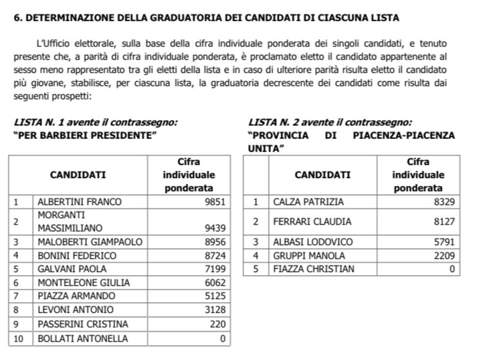 Si sono concluse le operazioni di spoglio al termine della giornata di voto per l’elezione del nuovo consiglio provinciale. Sette i seggi conquistati dalla lista “Barbieri presidente”, tre per “Provincia di Piacenza-Piacenza Unita”.
