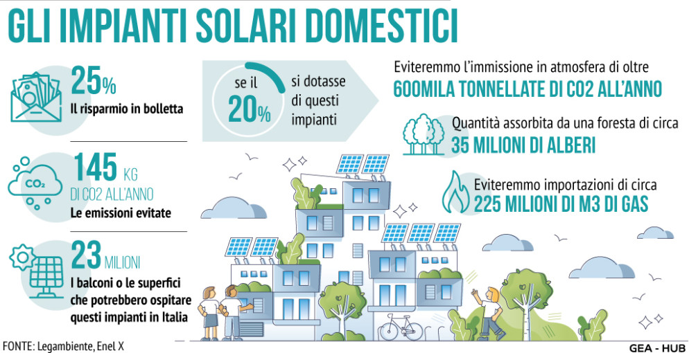 Un solo pannello solare da appartamento evita l’immissione in atmosfera di 145 chili di Co2 all’anno, la stessa quantità assorbita da circa 10 alberi.