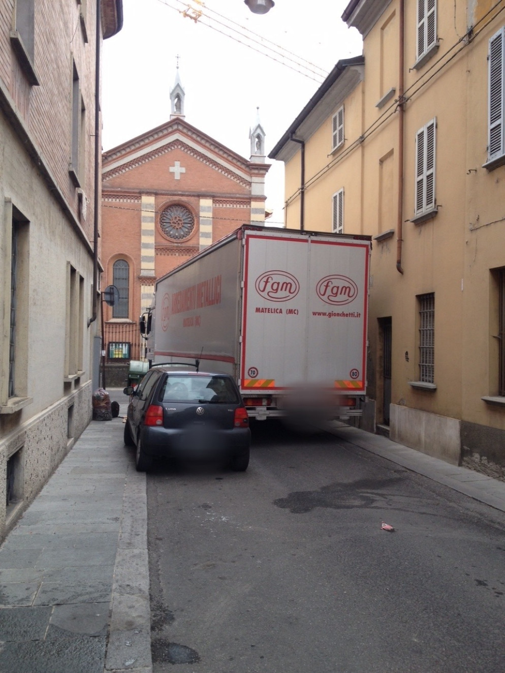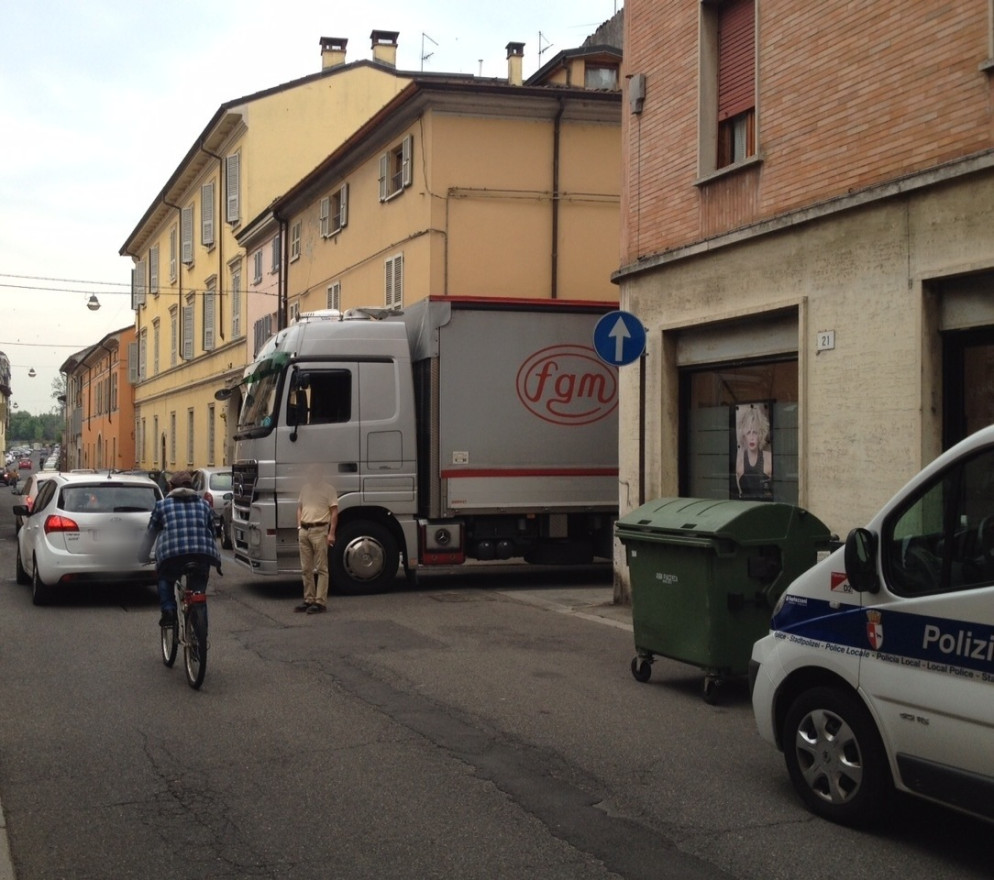 Ha seguito le indicazioni del navigatore satellitare per raggiungere una strada cittadina e si è ritrovato “incastrato” tra via Gaspare Landi e via Torta: protagonista un autotrasportatore italiano che questa mattina, intorno alle 9, ha paralizzato il traffico della zona per una quindicina di minuti.