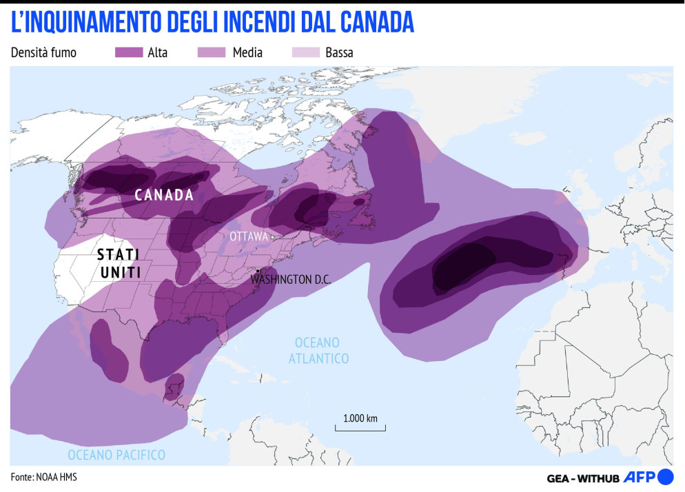 Nell’infografica di Gea-Afp, la diffusione dell’aerosol causato dagli incendi in Canada. L’aerosol atmosferico è composto da particelle e corpuscoli in sospensione all’interno dell’atmosfera.