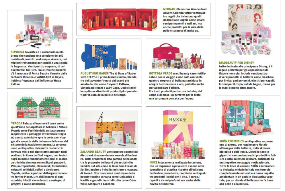 È diventato ormai di gran moda, infatti, anche fra gli adulti anticipare la gioia attraverso quelli che sono sempre stati chiamati calendari dell’Avvento. Un modo, fatto di piccoli regali quotidiani, per celebrare il conto alla rovescia che termina la vigilia e rallegrare le giornate in vista dell’apertura dei doni più consistenti la notte di Natale. Se prima era un’abitudine solo dei più piccoli, a cui a inizio dicembre si regalano calendari contenenti giochini e cioccolatini, da qualche anno anche il mondo della cosmetica propone per gli appassionati del tema i propri calendari con prodotti e accessori di bellezza.