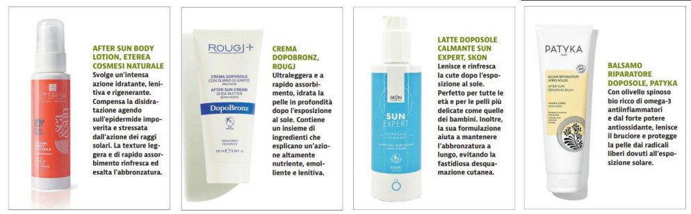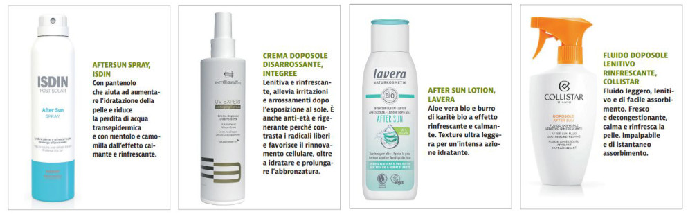 «Glicerina, basse percentuali di urea, estratto di aloe vera, lipidi emollienti, acido ialuronico ed estratti botanici lenitivi sono solo alcuni degli ingredienti maggiormente studiati e utilizzati nelle emulsioni da applicare dopo l’esposizione solare. Non è poi soltanto la crema a rendere la pelle morbida mantenendo inalterata la perdita di acqua transcutanea: serve una cura costante, giornaliera, rappresentata dall’esfoliazione della pelle con appositi scrub cutanei, che aiutano a togliere gli strati più superficiali di cellule morte, e dall’applicazione di un’appropriata quantità di protezione solare e prodotti idratanti. Infine, non dimentichiamo l’importanza di un’alimentazione sana e varia, perché la salute e la bellezza della pelle passano principalmente dall’interno».