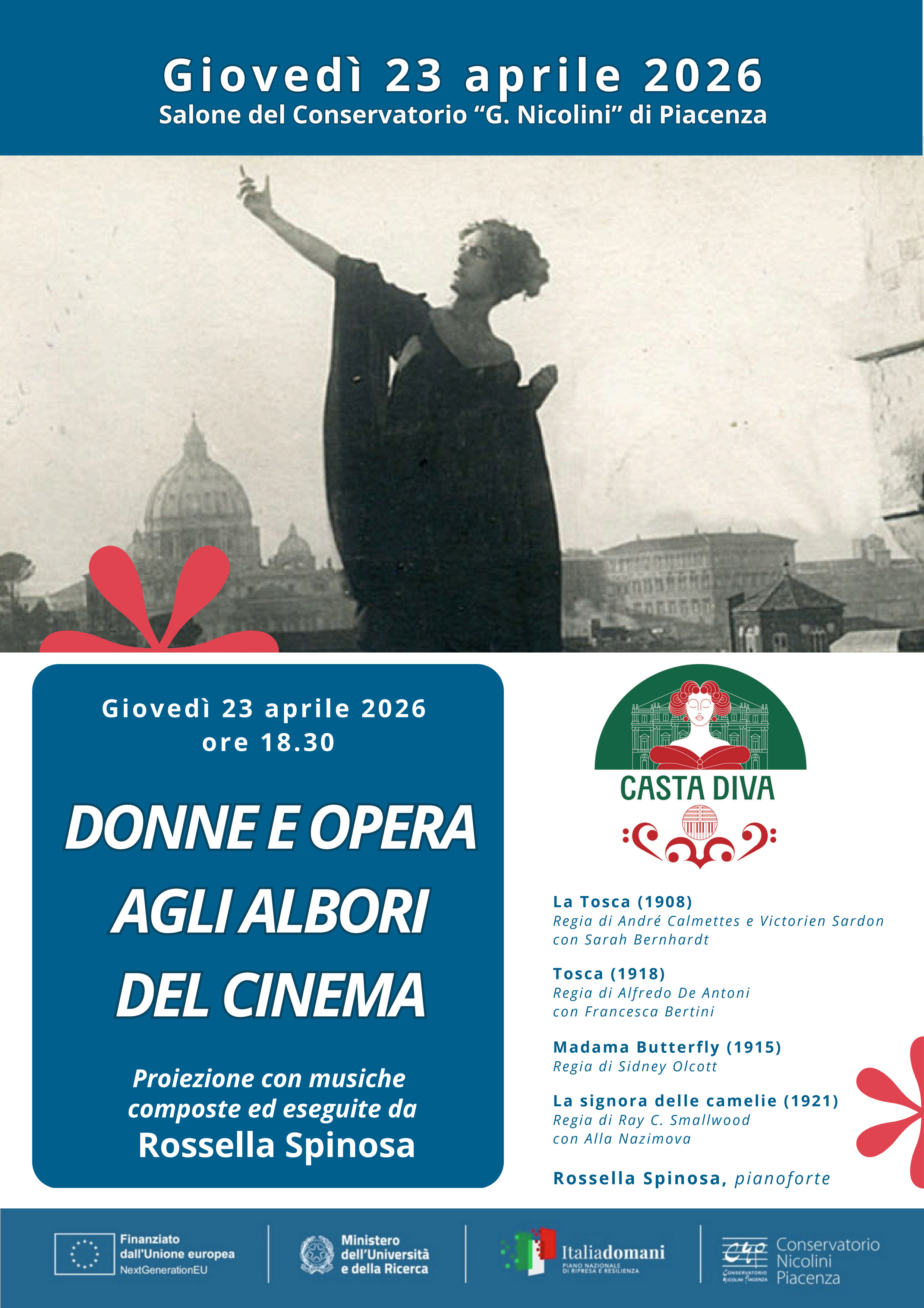 A seguire, alle ore 18.30, il pomeriggio proseguirà nel Salone dei Concerti con “Donne e opera agli albori del cinema”, evento inserito nella rassegna Casta Diva. Protagonista sarà la pianista e compositrice Rossella Spinosa, che accompagnerà dal vivo una selezione di film muti, restituendo al pubblico il fascino originario del cinema delle origini.