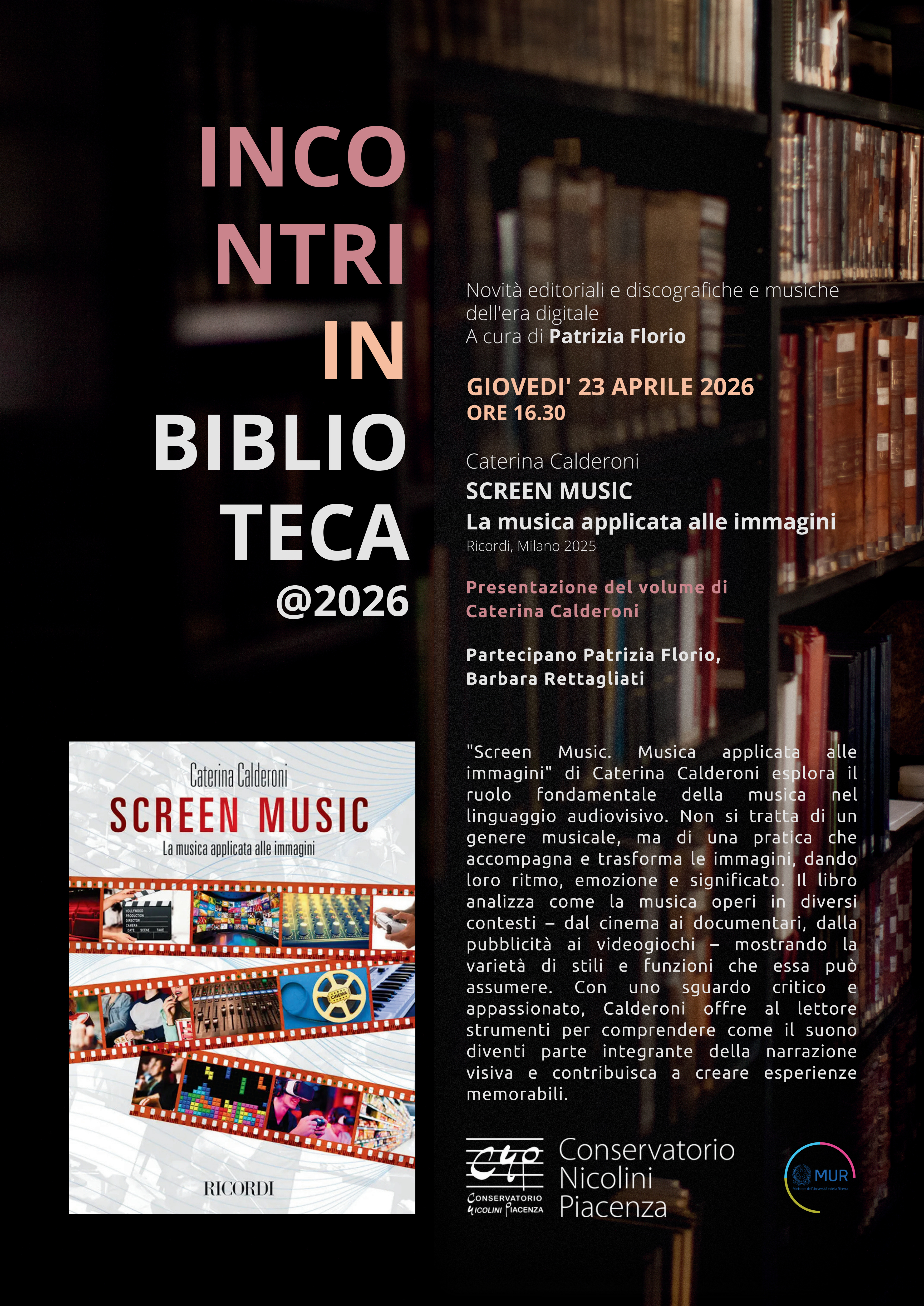 Un pomeriggio che intreccia parole, immagini e suoni, mettendo al centro il dialogo tra musica e cinema: è questo lo spirito dell’appuntamento in programma giovedì 23 aprile al Conservatorio Nicolini. Alle ore 16.30, nella biblioteca del Conservatorio, Caterina Calderoni presenterà il volume “Screen Music – La musica applicata alle immagini”, pubblicato da Ricordi all’interno della rassegna “Incontri in Biblioteca – Novità editoriali e discografiche e musiche dell’era digitale”, curata da Patrizia Florio. In dialogo con l’autrice interverranno la stessa Florio e Barbara Rettagliati, dando vita a un confronto che promette di approfondire uno dei linguaggi più affascinanti e trasversali della contemporaneità.