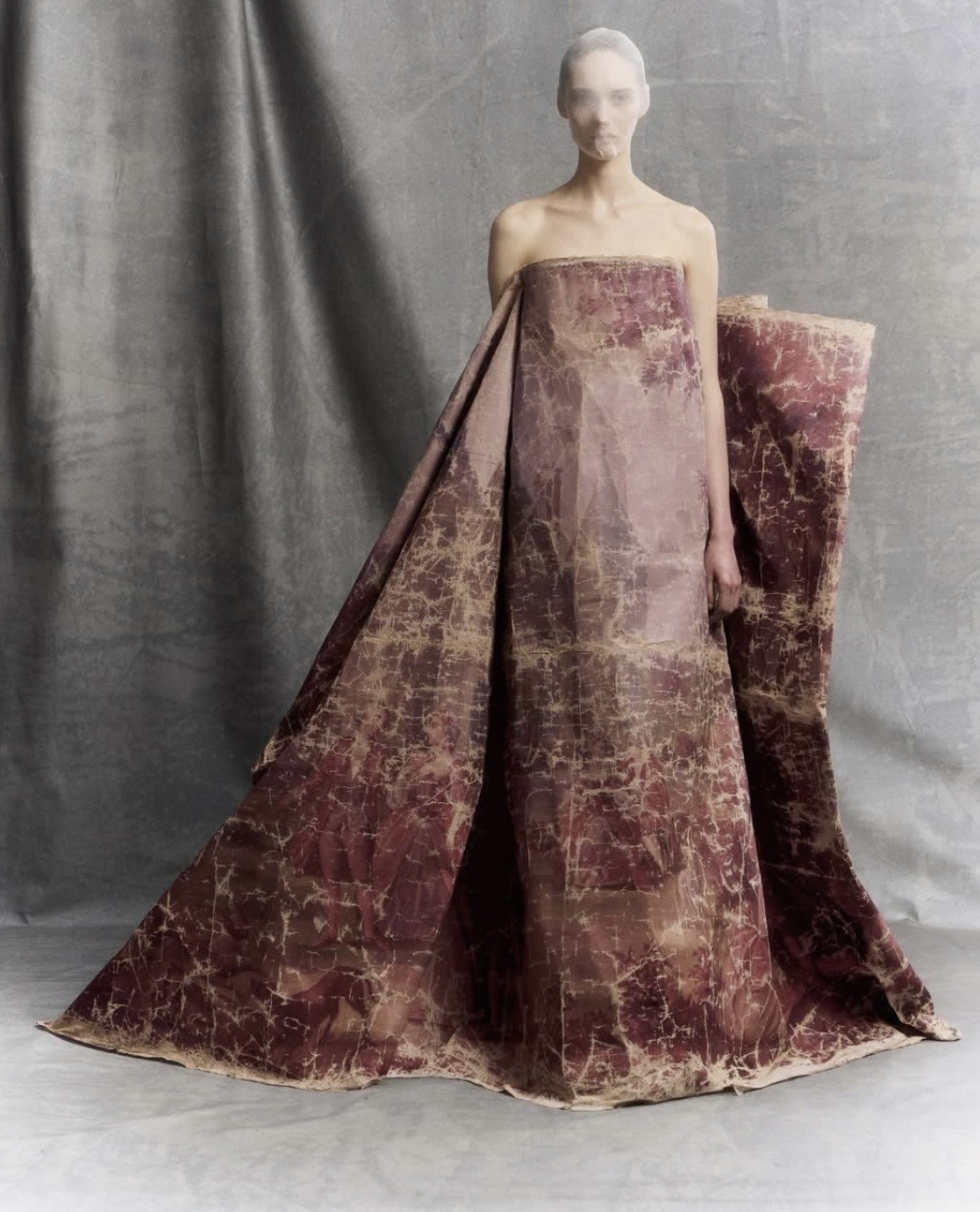 Al centro di questa narrazione c’è un evidente omaggio alla Cina, sempre filtrato attraverso la lente della sperimentazione: la porcellana. Martens la reinterpreta in due modi opposti ma complementari, da un lato ricreandone la trasparenza e la profondità attraverso strati sovrapposti di organza stampata, dall’altro ricostruendola fisicamente applicando pezzo dopo pezzo cocci di ceramica su un abito. Con la Linea 0 (l’Artisanal, haute couture), vecchi arazzi, tessuti d’arredamento e abiti di seconda mano vengono smembrati e riassemblati attraverso operazioni di upcycling che includono il ricamo e l’accoppiatura con tessuti strappati; tra le tecniche più insolite emerge la spalmatura della cera d’api e l’impressione di interi completi edoardiani, gioielli compresi, che vengono poi applicati sugli abiti. È un processo curioso in cui si vedono corsetti nati dalle impronte dei gioielli, e perfino un imponente dipinto di sei metri drappeggiato con una maestria tale da diventare un abito fluido. La stessa ossessione per il tridimensionale si riflette nel prêt-à-porter dove pelle, velluto e tweed sono incollati su giacche e gilet strutturati, creando l’illusione di silhouette sartoriali classiche che, a uno sguardo più attento, rivelano stampe che creano l’effetto craquelè tipico della Maison. Ogni uscita è stata resa anonima e universale dalle maschere, elemento iconico della casa, realizzate in materiali che spaziano dalla pelle alla cera fino all’organza sottile arricchita da ricami 3D. Dalla sfilata emerge chiaramente che Martens ha compreso profondamente l’anima di Margiela: quella capacità di inventare strumenti per far sparire il designer e lasciare che sia l’opera a parlare. L’evento è anche uscito dai confini della passerella con il progetto “MaisonMargiela/folders”, scelta che cattura perfettamente lo spirito di Shanghai: un’irruzione artistica che spunta all’improvviso in una via qualunque, cattura gli sguardi e i telefoni di tutti per qualche giorno e poi svanisce nel nulla. È come se avessero paracadutato in città un parco giochi della moda, permettendo ai passanti di camminare tra lunghi abiti da sera cerosi e fatti di cocci. Anche grazie al dialogo tra l’haute couture e la vita di strada, questa collezione riflette bene una generazione che oggi più che mai vuole una moda meno esclusiva e che estragga valore da ciò che è considerato scarto, trasformando il passato in un linguaggio visivo fatto di sperimentazioni e, finalmente, proiettato in avanti.