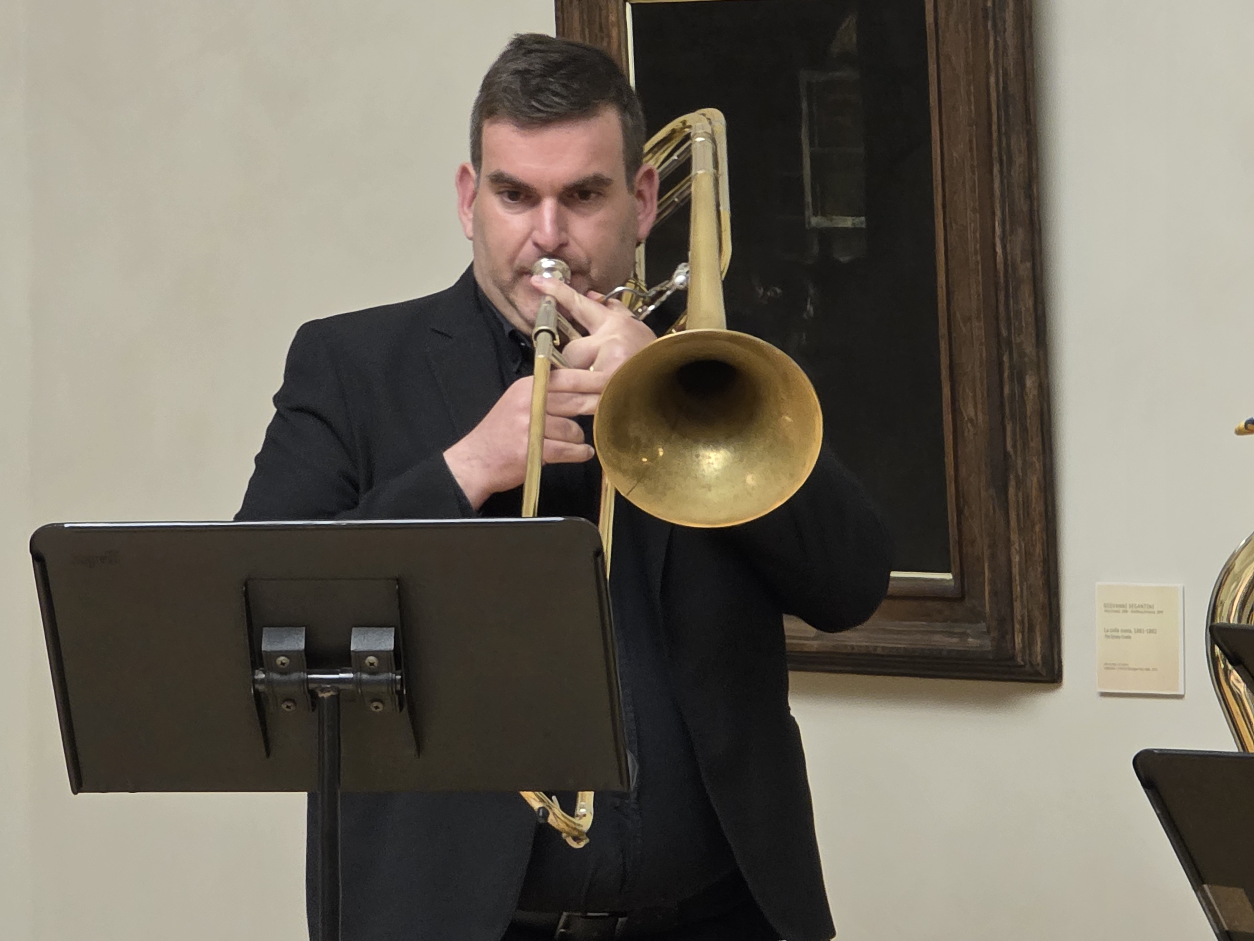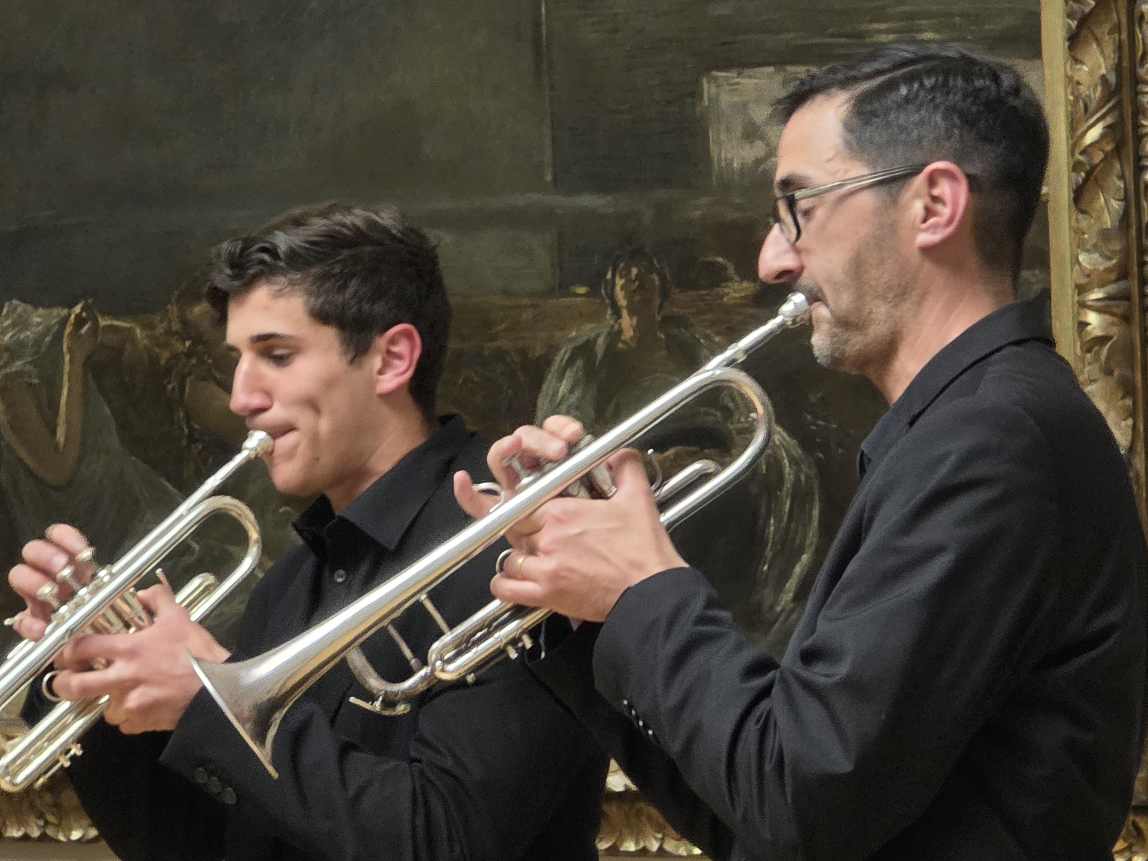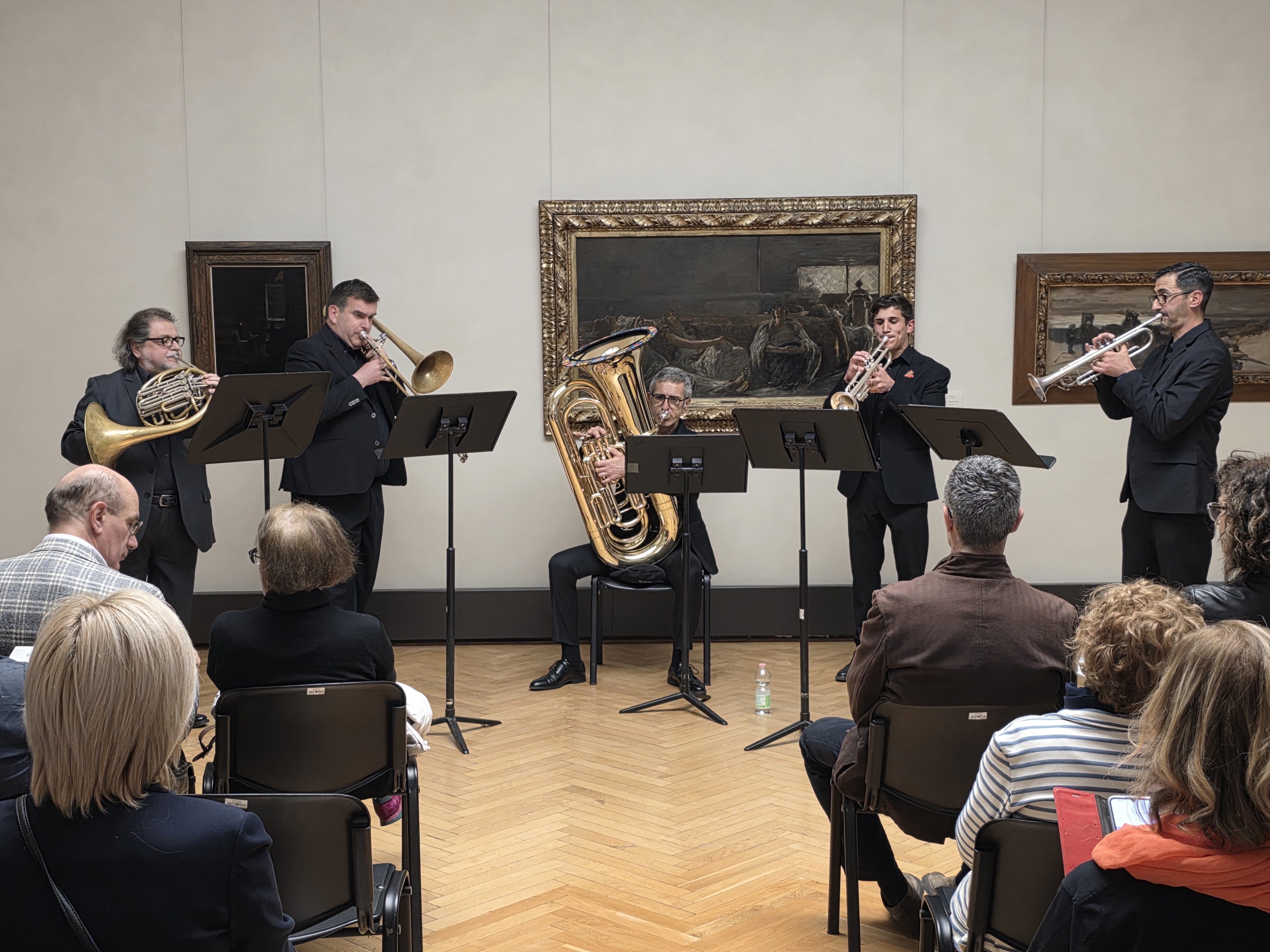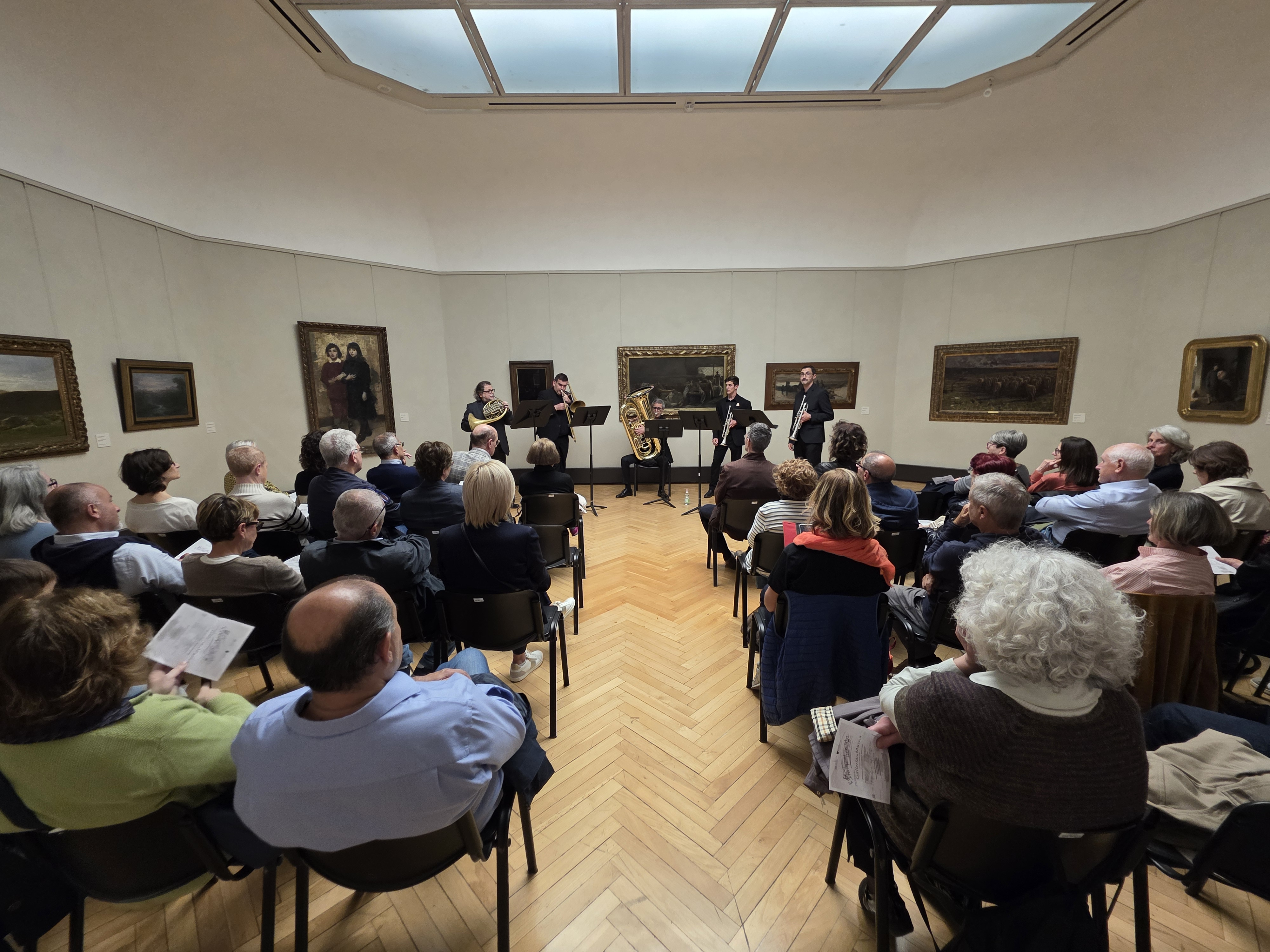 Protagonista della serata è stato l’Antonino Votto Brass Ensemble, formato da docenti e studenti del Conservatorio: Roberto Rigo e Paolo Subacchi alle trombe, Alfredo Pedretti al corno, Giuseppe Zizzi al trombone e Giovanni Cicchelli alla tuba. L’ensemble ha proposto un viaggio tra epoche e stili diversi con musiche di Giovanni Gabrieli, Johann Sebastian Bach, Giuseppe Verdi, Nino Rota, Maurice Ravel ed Ennio Morricone. Il suono degli ottoni ha saputo alternare brillantezza e profondità, guidando il pubblico in un percorso ricco di contrasti e suggestioni.