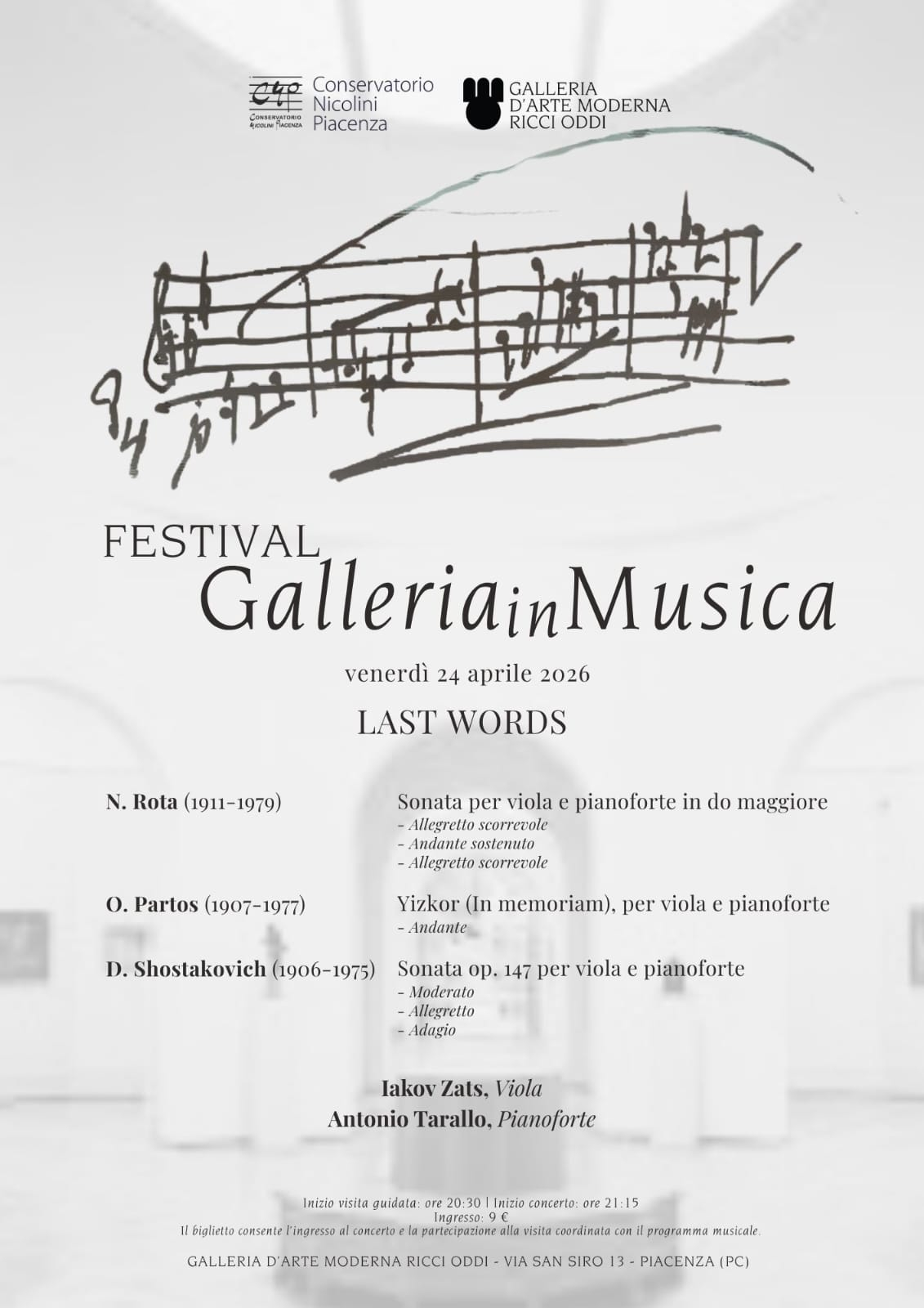 Il Festival terminerà venerdì 24 aprile con il concerto Last Words, mantenendo la formula che prevede la visita guidata alle ore 20:30 e il concerto alle 21:15 (ingresso 9 €). La serata vedrà protagonisti i docenti del Nicolini Iakov Zats alla viola e Antonio Tarallo al pianoforte, impegnati in un programma più intimo e riflessivo: la Sonata per viola e pianoforte in do maggiore di Nino Rota, Yizkor (In memoriam) di Ödön Pártos e la Sonata op. 147 di Dmitri Shostakovich.