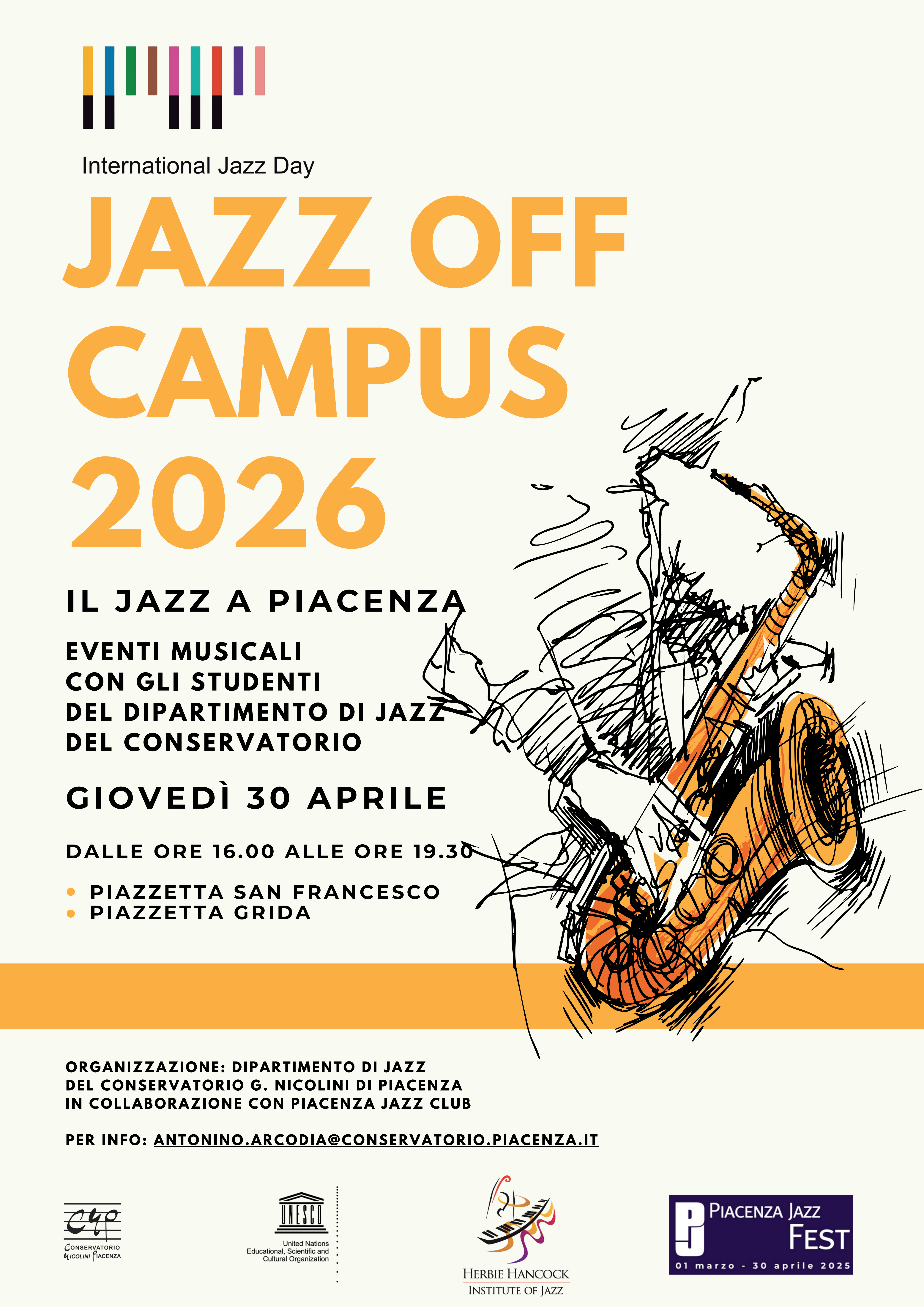 Piacenza si prepara a risuonare di jazz. Giovedì 30 aprile, in occasione dell’International Jazz Day, torna per il terzo anno consecutivo “Jazz off Campus 2026”, la manifestazione ideata dal Dipartimento di Jazz del Conservatorio Nicolini in collaborazione con il Piacenza Jazz Club.