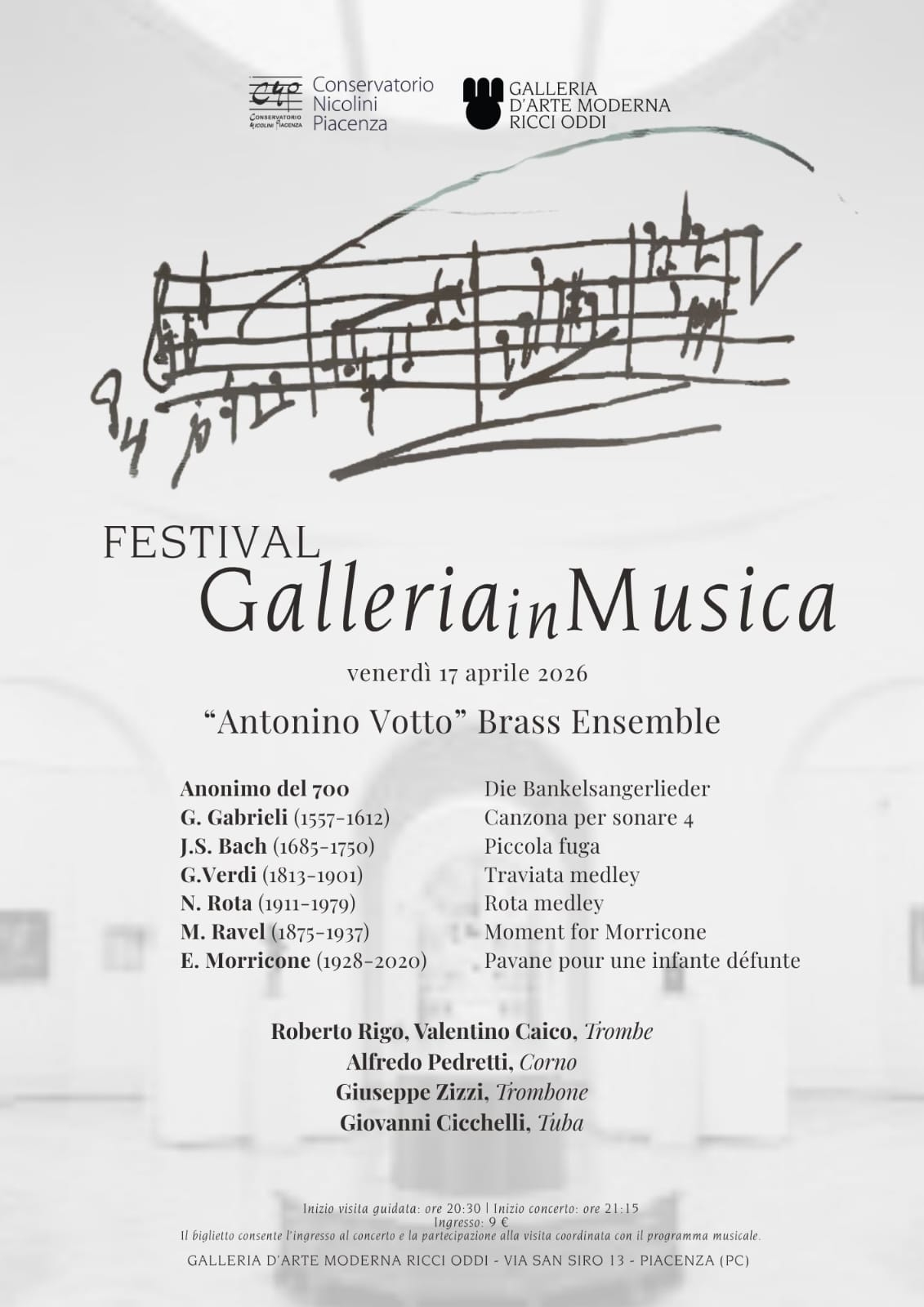 La rassegna prosegue venerdì 17 aprile con l’Antonino Votto Brass Ensemble, formato da studenti e docenti del Nicolini: Roberto Rigo e Valentino Caico alle trombe, Alfredo Pedretti al corno, Giuseppe Zizzi al trombone e Giovanni Cicchelli alla tuba. Anche in questa occasione sono previsti la visita guidata alle ore 20:30 e il concerto alle 21:15 (ingresso 9 euro). In programma musiche di Giovanni Gabrieli, Johann Sebastian Bach, Giuseppe Verdi, Nino Rota, Maurice Ravel ed Ennio Morricone, per un viaggio tra epoche e stili affidato al suono potente e raffinato degli ottoni.