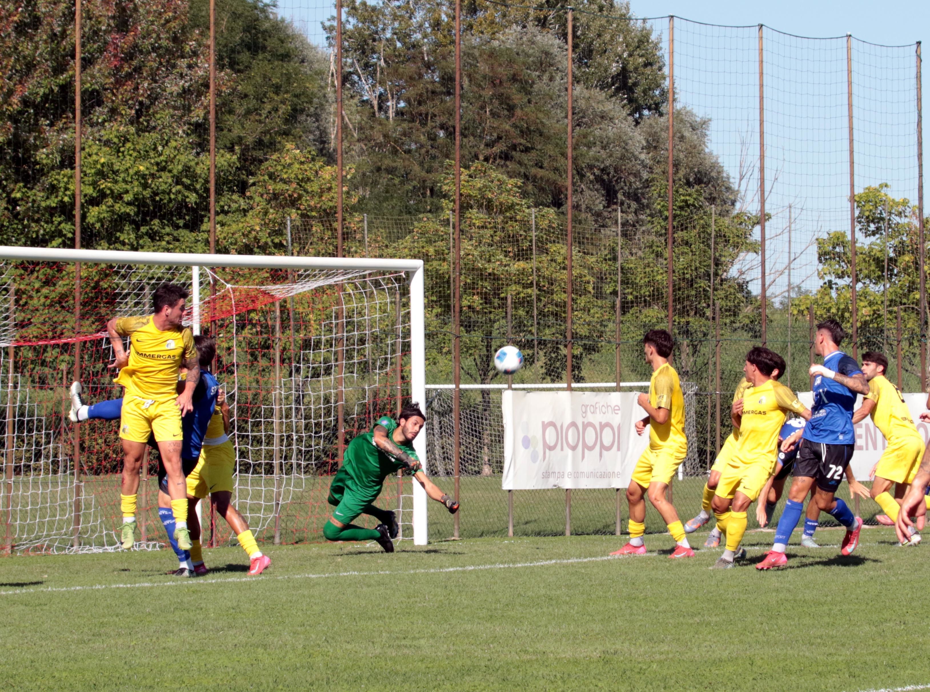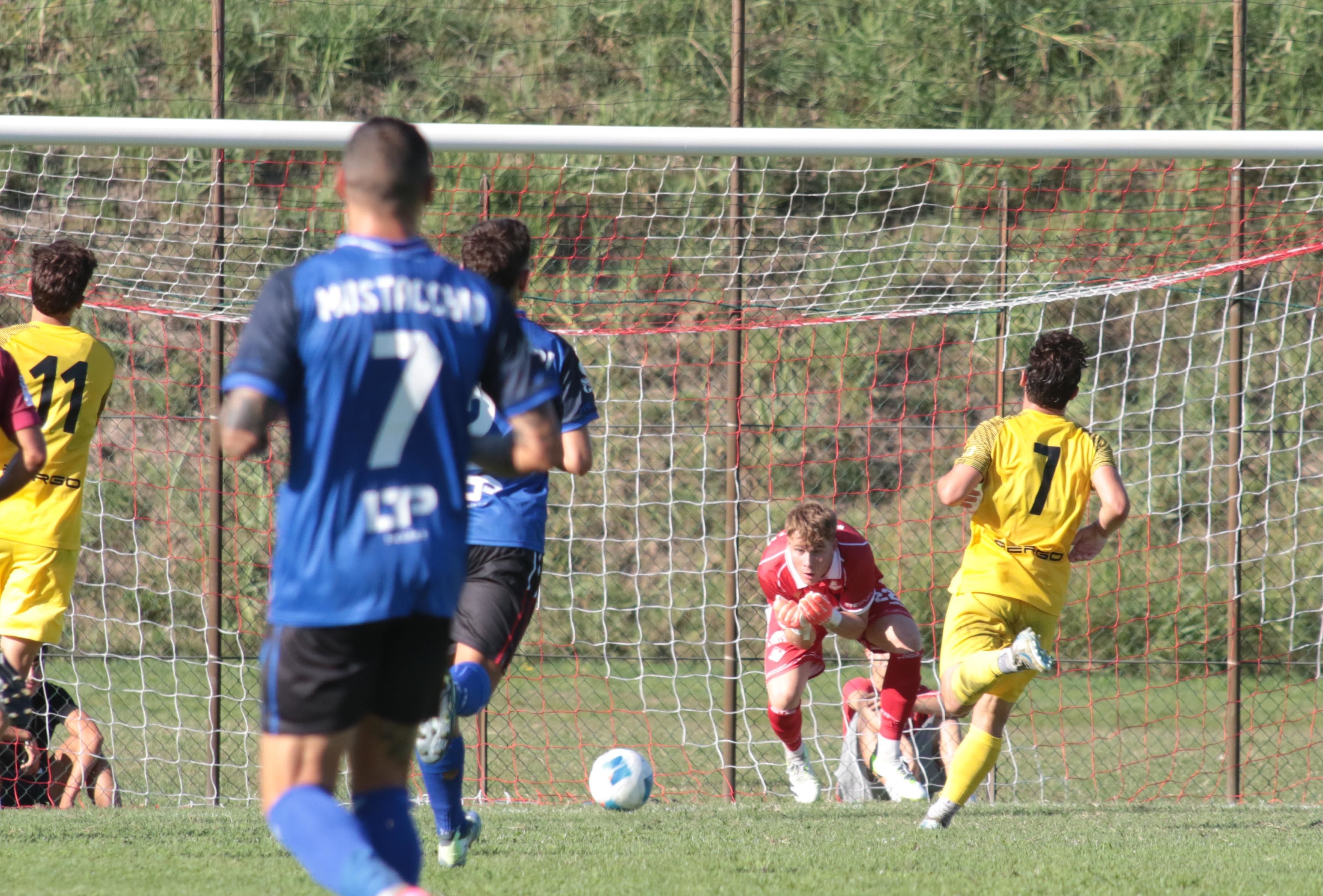 Più manovriero il Lentigione, che tiene le linee vicine e cerca cambi di fronte rapidi: su uno di questi, Ribero s'impegna in una non facile uscita bassa su pallone di Mordini dalla sinistra (15'). L'esterno dal limite di D'Agostino, alto, cade al minuto 21. Da qualche minuto il Piace ha preso campo, anche se continua a costruire con poco palleggio, Poledri è quasi sempre saltato dallo sviluppo dell'azione. Assenti gli inserimenti dei centrocampisti. Sembra esserci un rigore evidente per trattenuta di Ciuffo su Mardini, l'arbitro fischia fallo per noi. Poi succede il contrario: Campagna, il più intraprendente, scambia con Poledri e entra in area, viene a contatto con Nappo e va giù: rigore non immenso, Trombetta spiazza il portiere al 37'. Il Piace molla un po' gli ormeggi.