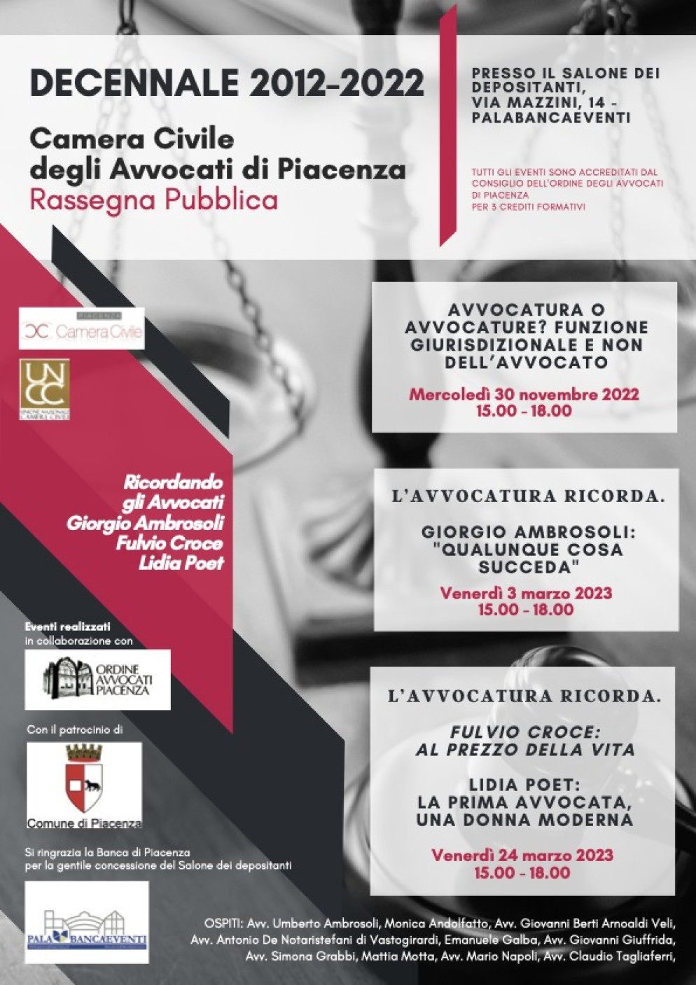 Si intitola “Giustizia e legalità, coraggio e innovazione”, ed è la rassegna pubblica che la Camera civile degli avvocati di Piacenza ha organizzato per celebrare i dieci anni dalla sua fondazione e per far conoscere ai cittadini i nuovi ruoli della figura professionale.