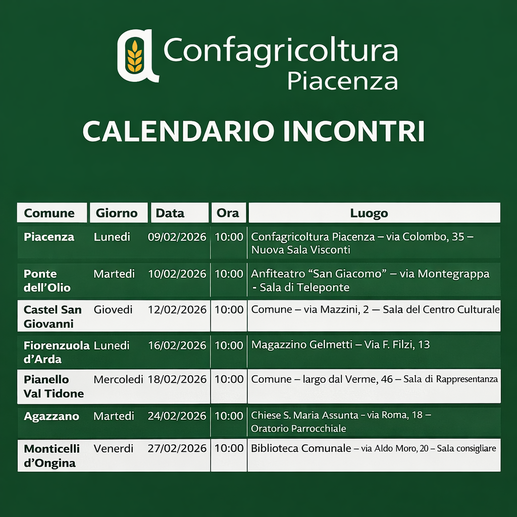 Prenderanno il via lunedì 9 febbraio gli incontri sul territorio promossi da Confagricoltura Piacenza, appuntamenti ormai consolidati che rappresentano un momento centrale di confronto diretto con i soci sui principali temi economici, tecnici e sindacali di interesse per le imprese agricole della provincia. Il ciclo di incontri si aprirà presso la Nuova Sala Visconti della sede di Confagricoltura Piacenza, dove i funzionari relazioneranno tutti in presenza, per poi proseguire nelle diverse aree del territorio secondo il calendario programmato.