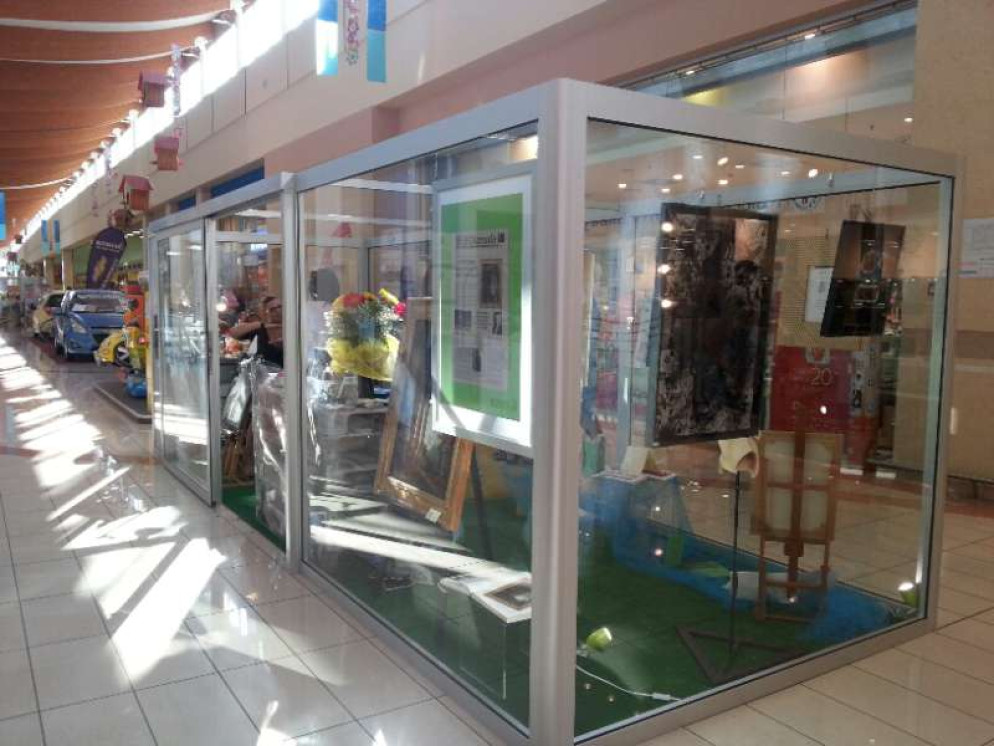 Il punto espositivo e laboratorio è un cubo di vetro trasparente, situato al centro della galleria, che permette ai passanti, magari intenti a far compere, di osservare l’artista al lavoro e, al tempo stesso di ammirare, gratuitamente, i pezzi di grandi autori.