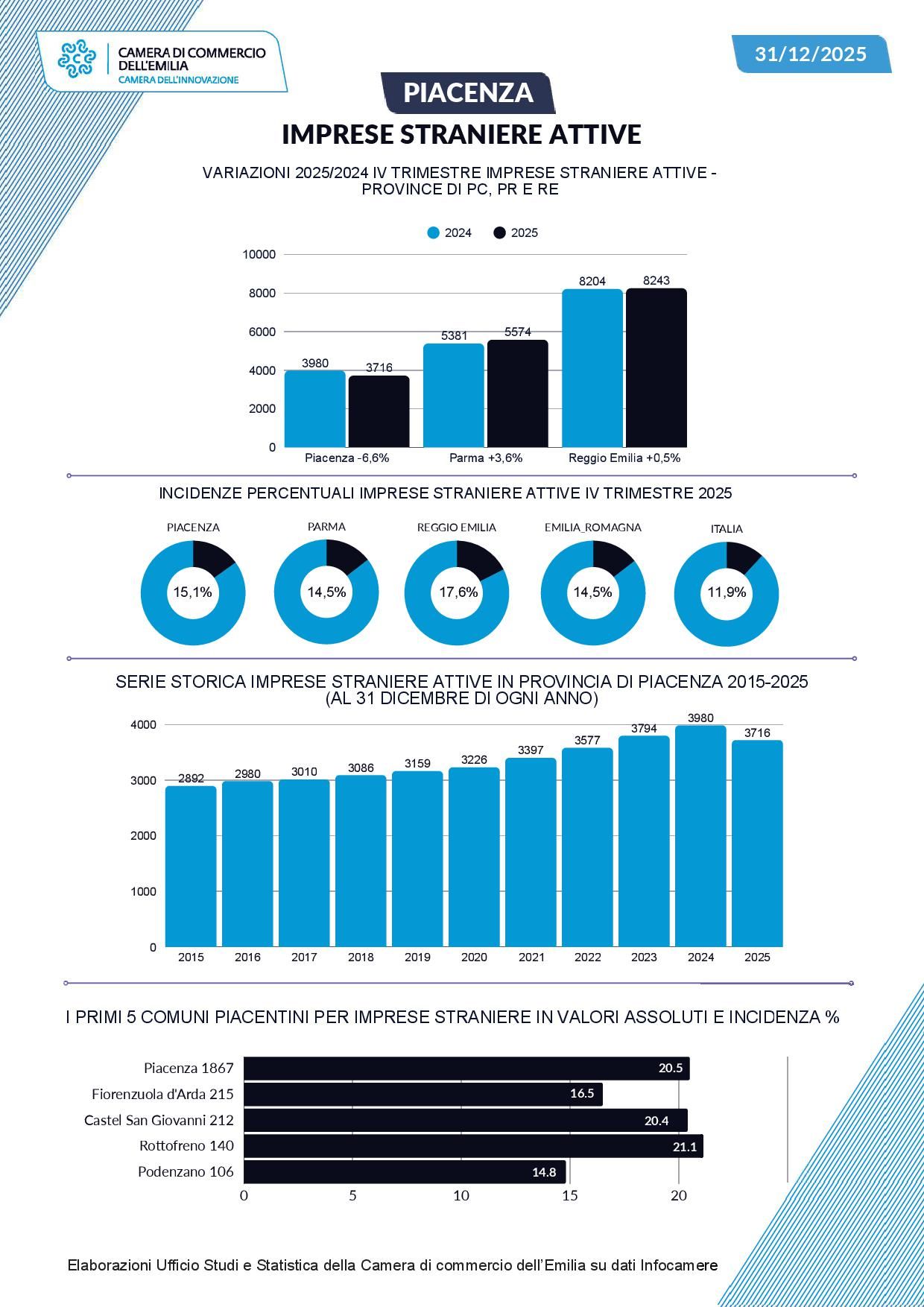 Sono scese a quota 3.716, nel 2025, le imprese attive straniere in provincia di Piacenza. La flessione - pari al 6,6% - oltre ad interrompere una serie storica positiva ultradecennale, inverte in misura marcata il +4,9%, che era stato certificato dall’Ufficio Studi e Statistica della Camera di commercio dell’Emilia alla fine del 2024.