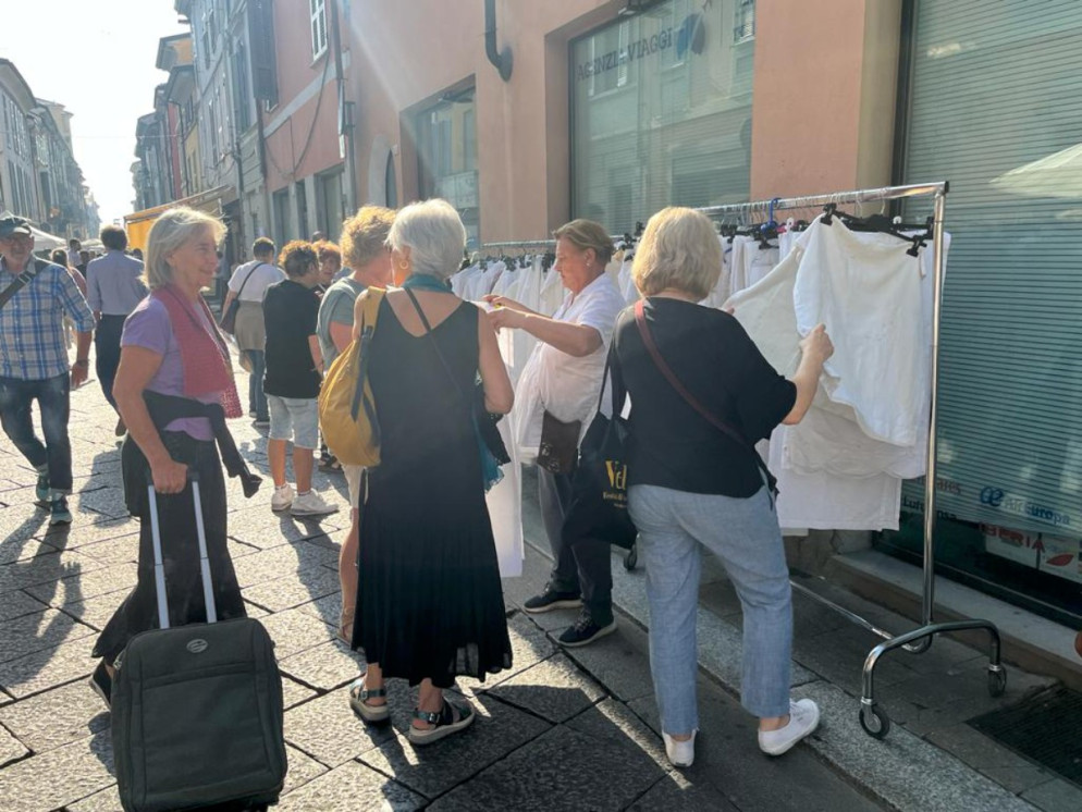 I commercianti dalla mattina presto sono pronti: per loro oggi è giorno di festa e per dimostrarlo vengono omaggiati da piccole sculture realizzate dall’artigiano Edo Pinotti con i pezzi del cedro del Libano che un tempo sorgeva ai giardini Margherita.