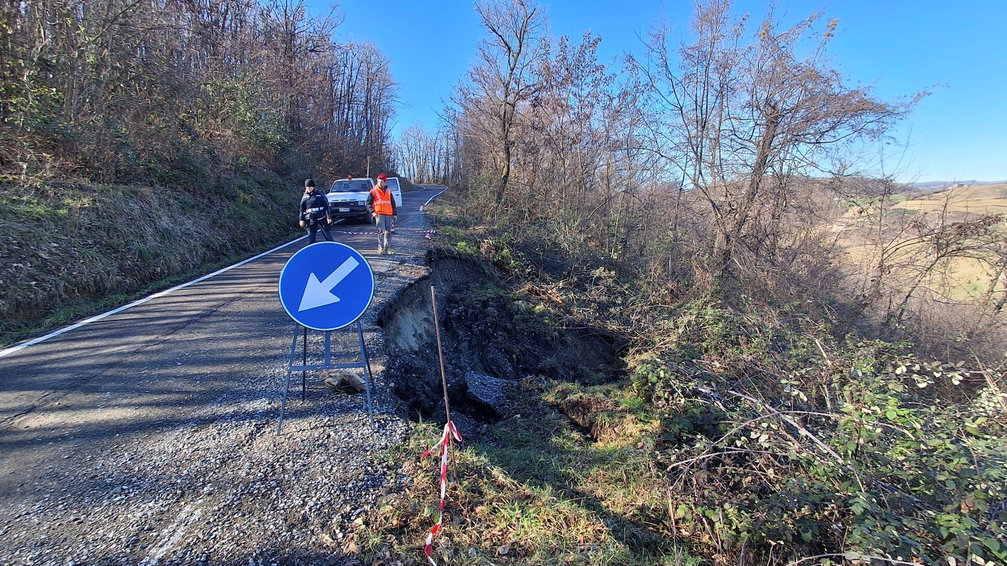 A Piozzano il forte temporale misto a neve di giovedì mattina ha fatto aprire un voragine lungo la strada di Bossolano che porta a Groppo Arcelli. Il cantoniere in forza al piccolo comune dell’Alta Valluretta passando ha notato in località Poggio che il terreno aveva iniziato a muoversi a causa del maltempo. Dopo qualche ora quel movimento si è trasformato in una vera e propria frana che si è portata via, verso valle, una porzione di strada. Per questo tutta la strada di Bossolano, da Case Zucconi in su, è interdetta al traffico per circa un chilometro di lunghezza. Non si passa con nessun mezzo. Per fortuna non ci sono abitazioni o frazioni che risultano isolate.