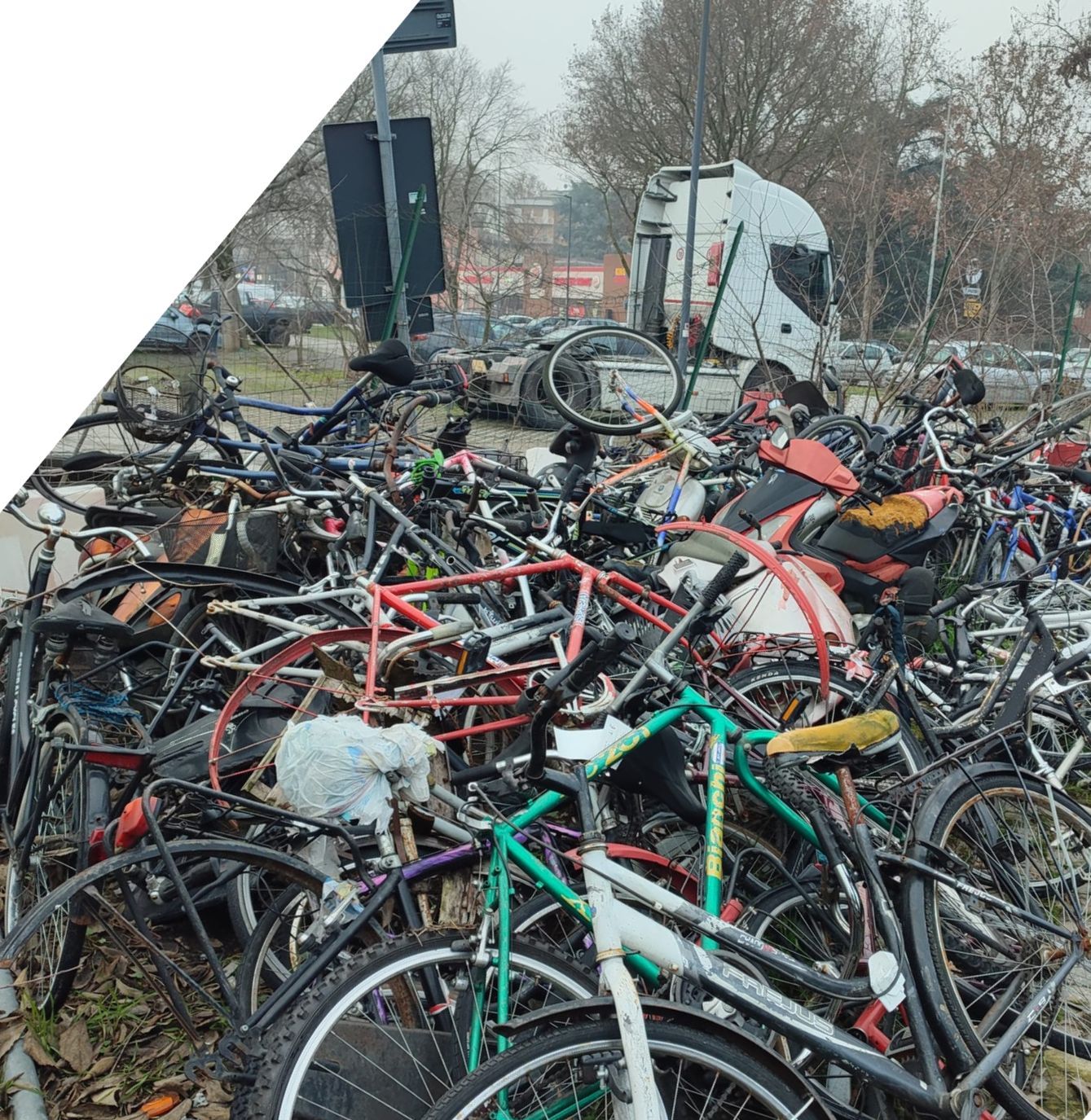 Cataste di bici abbandonate. Non è una situazione di degrado ma, al contrario, il risultato del contrasto al fenomeno dell'abbandono  in città di dueruote, spesso vandalizzate e depredate di sella, ruote, catena.