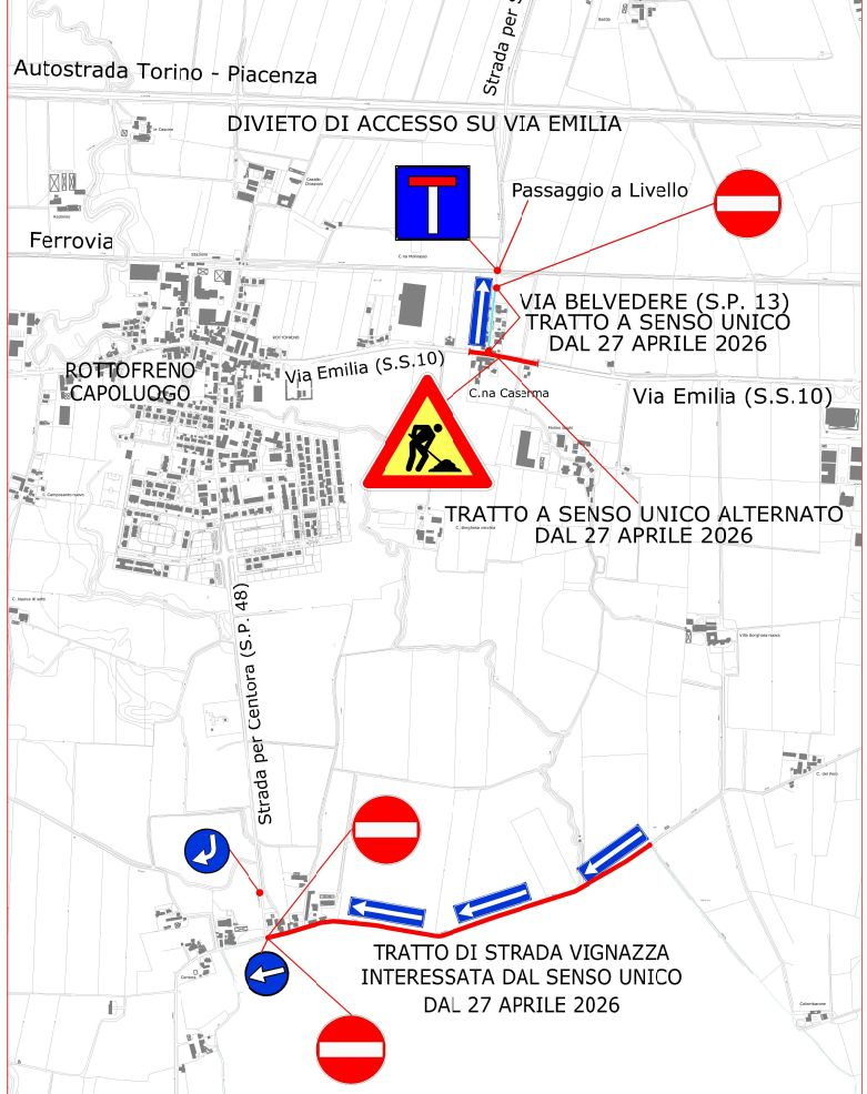 Il Comune di Rottofreno rende noto che nell’ambito dei lavori per la realizzazione del nuovo acquedotto intercomunale della Valtidone, a partire da lunedì 27 aprile e fino al 16 maggio, la viabilità sulla Via Emilia Strada - Statale 10, subirà significative variazioni. Il tratto interessato dai lavori è quello compreso tra Rottofreno e S. Nicolò, più precisamente in prossimità dell’intersezione stradale con la Strada Provinciale n. 13 per Santimento e Calendasco. L'intervento di Ireti, dal valore di oltre 4,5 milioni di euro, raddoppierà la linea idrica garantendo la continuità del servizio in tutta la zona.